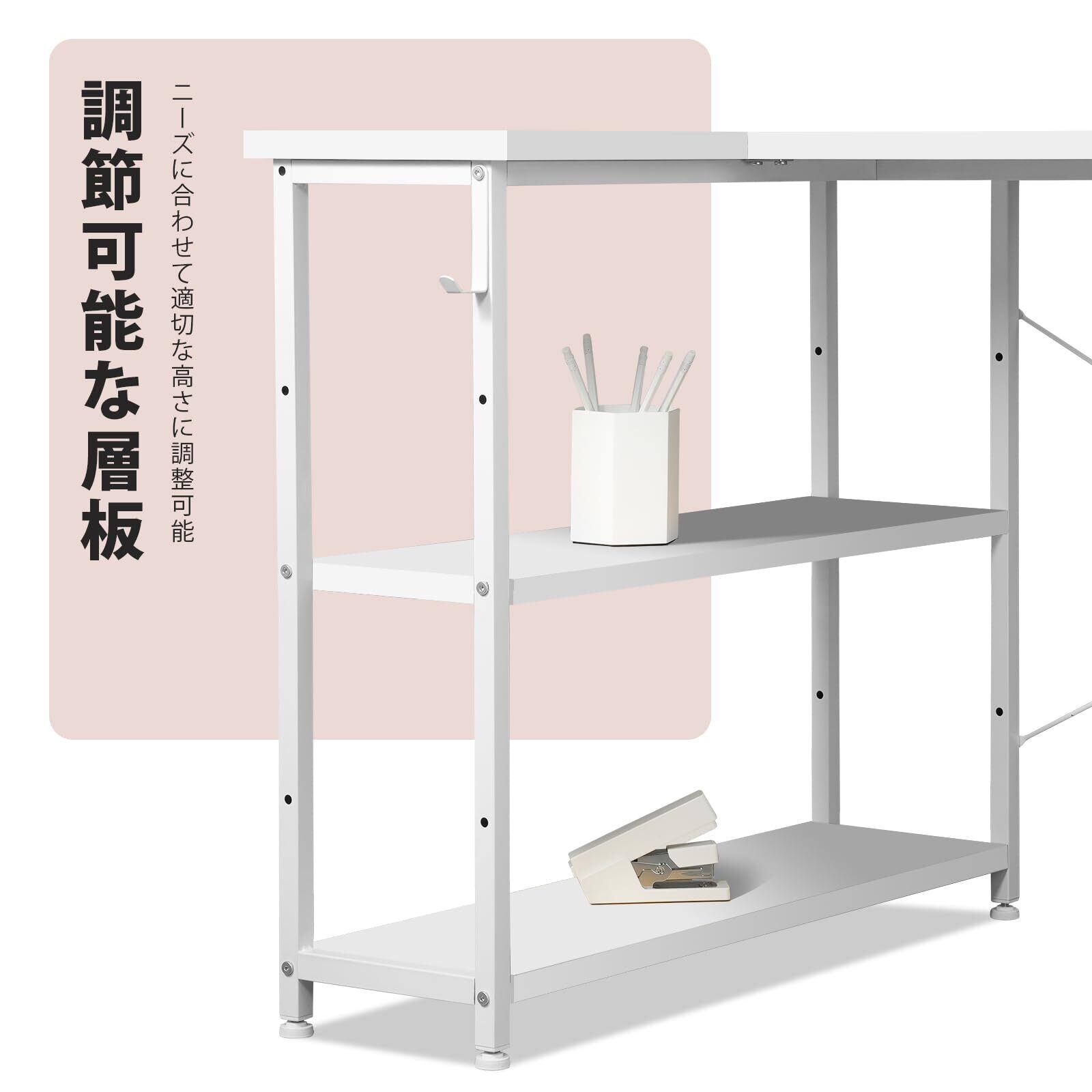 【十分な収納スペース】広い机の天板とオープンな足元スペースで作業が快適です。机には開放感のある収納袋が付属し、デスクワークをサポートします。L型棚は、中板の高さを調節できるので、必要に応じて高さを変えることができます。