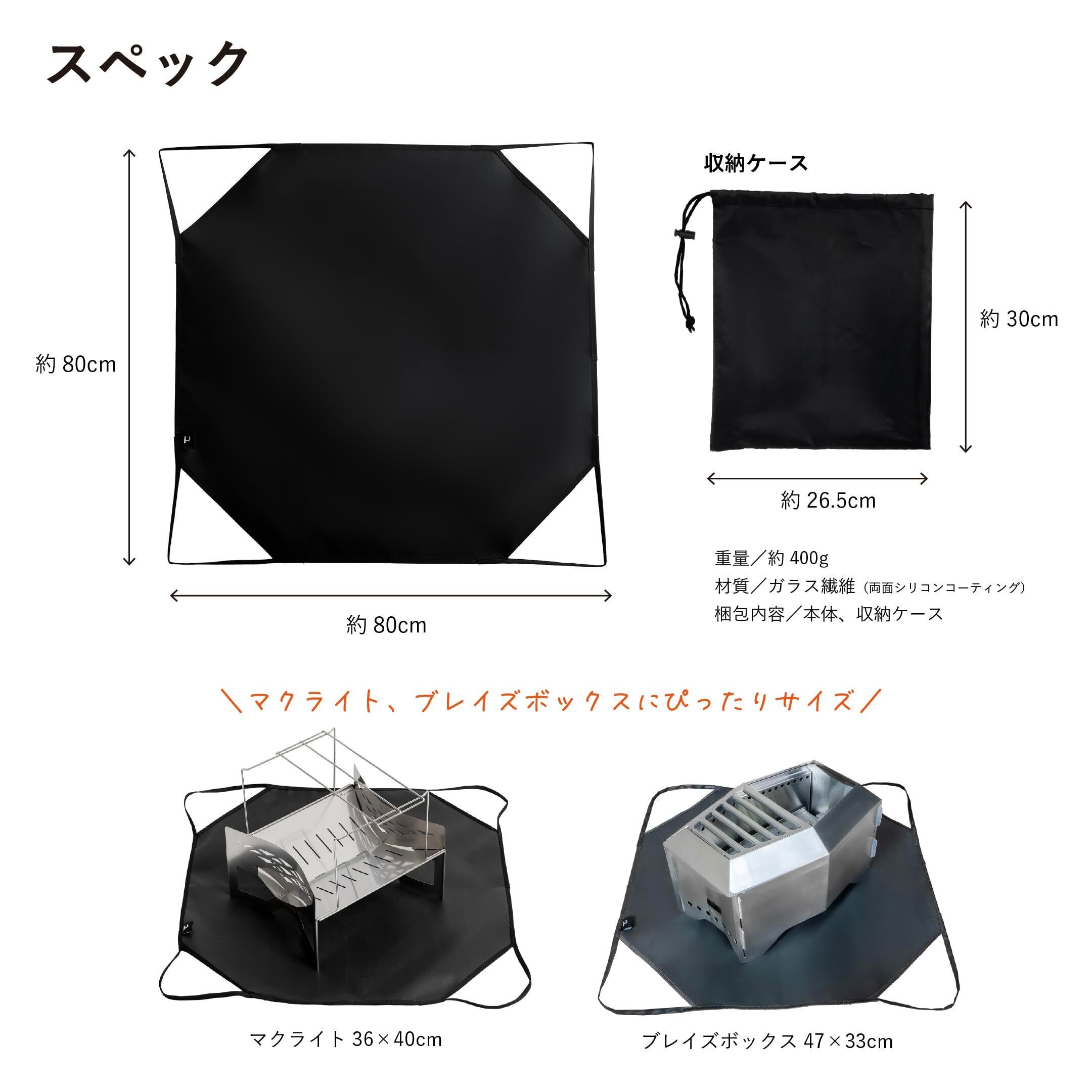 【耐熱温度600度・使いやすいサイズ】 黒(ブラック)のガラス繊維を採用。シート本体の耐熱温度は600度。縫製には燃えにくい難燃糸を使用しています。80cm×80cmの大判サイズで、マクライト・ブレイズボックスをはじめ一般的な焚き火台に適応します。