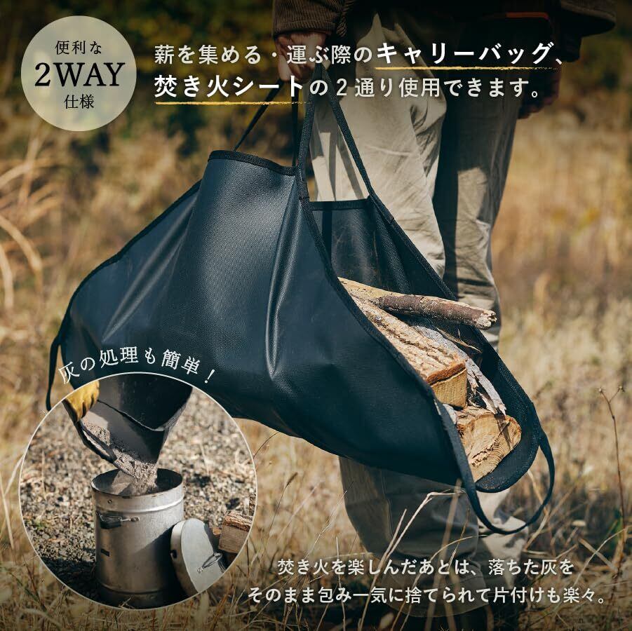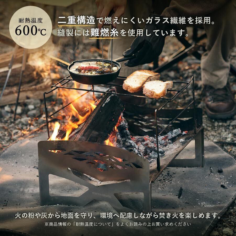 【薪運び・焚き火・灰処理をスムーズに】 TOKYO CRAFTSの焚き火シートは、耐熱600度のガラス繊維素材を使用し、焚き火やバーベキューで発生する火の粉や灰から地面をしっかりと保護します。ただ地面を保護するだけでなく、薪バッグとして薪を持ち運び、灰の後片付けもさっと行える便利な多機能なデザインです。シリコンコーティングにより汚れが付きにくく、お手入れも非常に簡単です。※注意事項をよく読みご購入ください