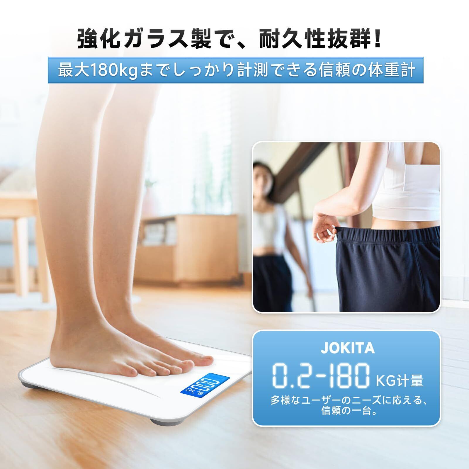【滑り止めデザイン-単位切り替え】本体は強化ガラス製で、最大180kgまで耐えることができます。厚さは30mmで、狭いスペースに収納することができます。本体の重さは約1kgで、持ち運びが便利です。四隅にゴムバンドが付いておりズレにくいのもポイントで、床を傷つける心配はありません。単位切り替え:この体重計は、kg、LB、ST:LBの3つの単位で使用できます。