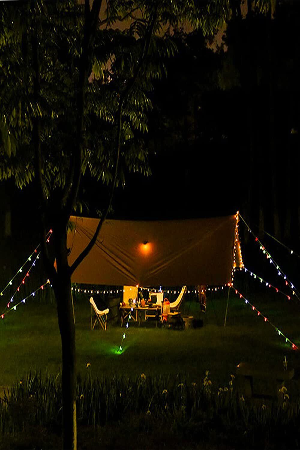 【夜間の安全対策】テントやタープのロープが見えづらい灯りのない大自然の中のキャンプには必須のアイテム。ロープライトを設置していれば、どこにロープが張られているか直ぐに確認できます。