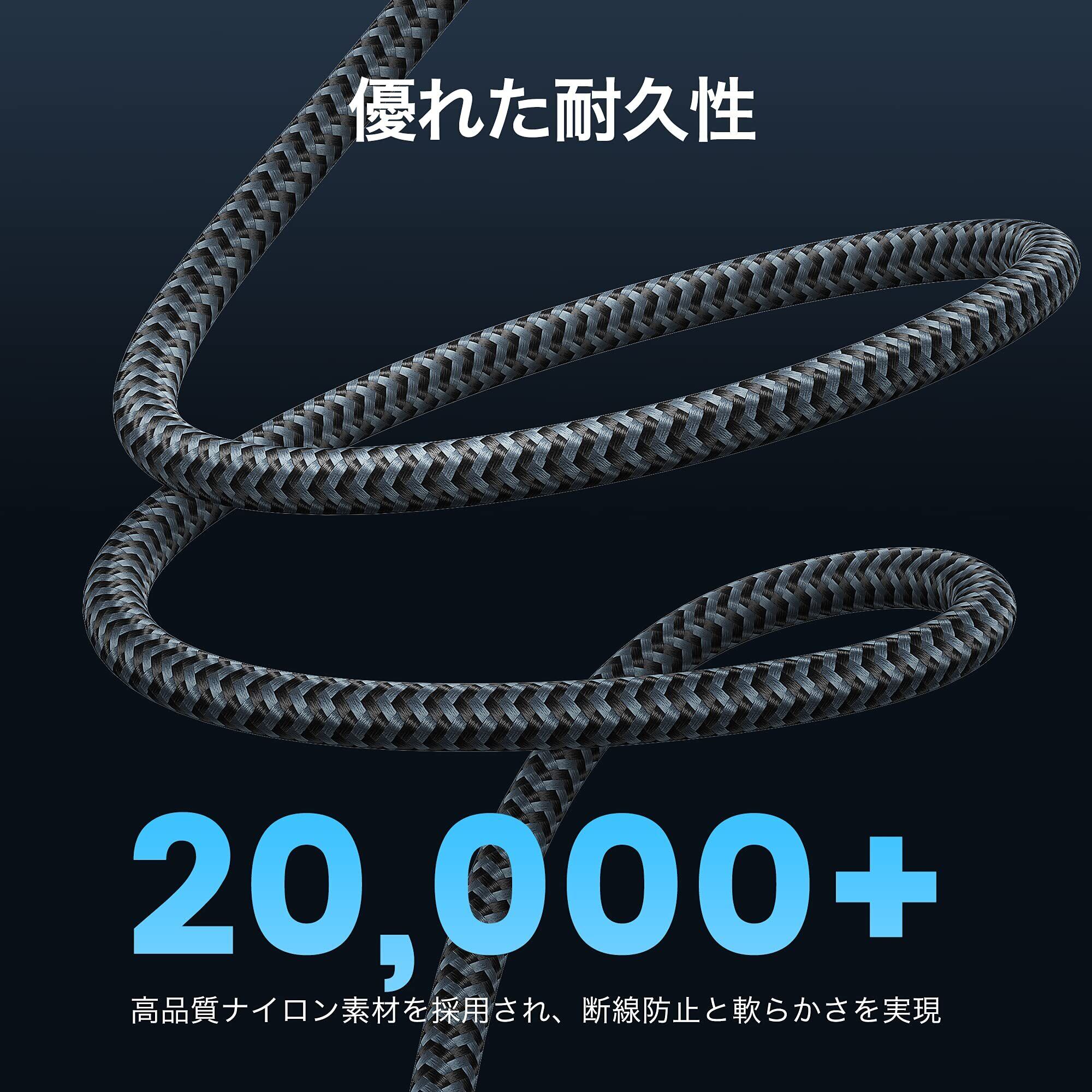 【耐久性と柔軟性を両立】ナイロンの二重編み込み素材を採用し、丈夫で信頼性の高いUSB Cケーブルを提供します。20,000回以上の曲折テストにたえて、頻繁な挿抜や長時間の使用にも耐えられます。