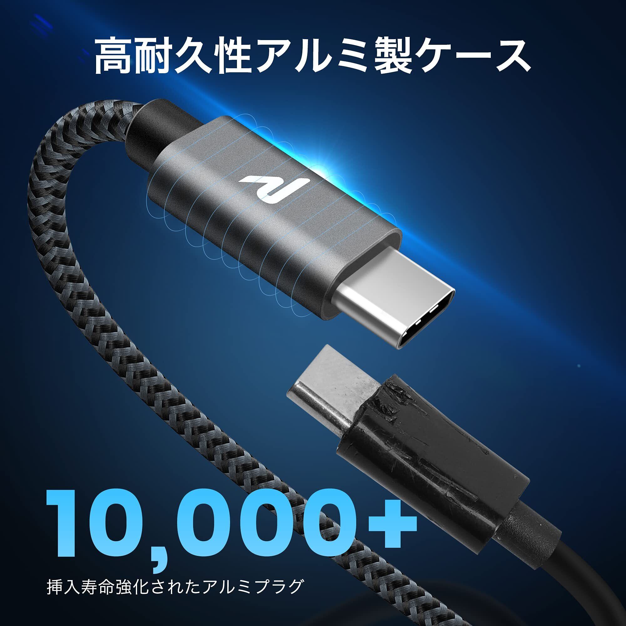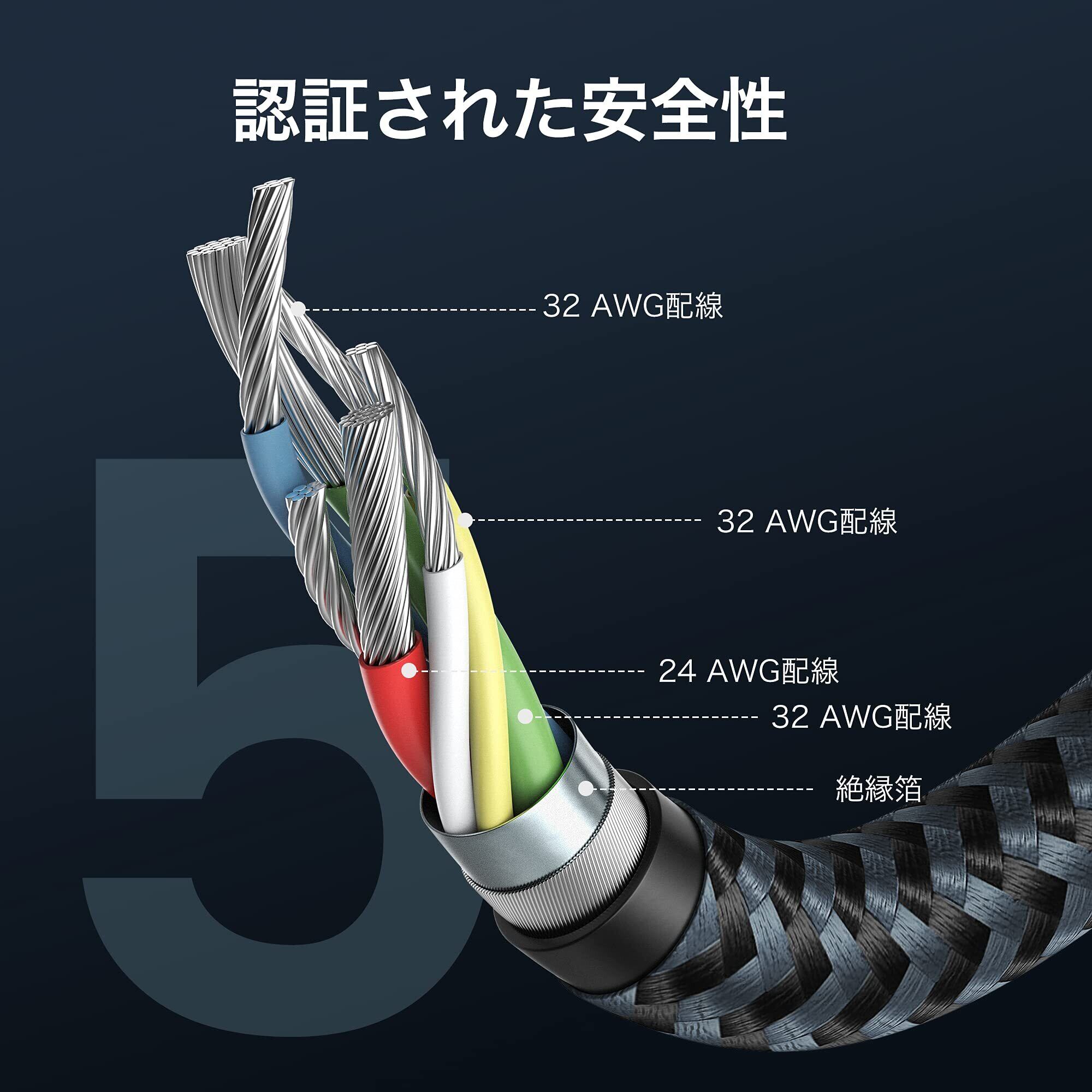 【安全な保護機能搭載】過充電、発熱と短絡を防止する機能を搭載し、安定性の高い急速充電と大切な機器の損傷防止を実現します。サビなどに強く信号劣化を抑える金メッキピンと難燃性の素材を採用し、安全性を高めています。安全と性能を保障するために、製品を使用しない場合はUSB-CインターフェースをPE保護カバーで覆いてください。インターフェースが濡れたり、導電性の異物が侵入しないように注意してください。