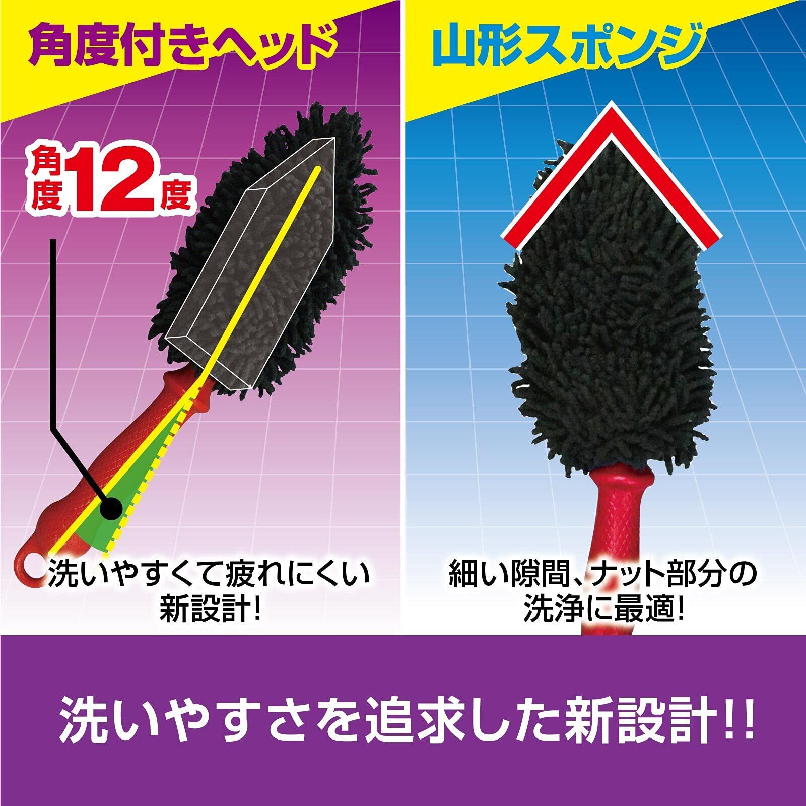 ツイスト加工されたマイクロファイバーが、ガンコな汚れやブレーキダストを絡め取り、さらに、内部の山型スポンジ形状により、細いスポーク部の汚れや隙間汚れをしっかりと落とします。 柄の角度(12度)を人間工学的な視点で設計し、洗いやすい柄の角度にしました。また、手になじむグリップ形状でフィット感も抜群です。 これ1本でスピーディーに洗えて、とってもラクに作業が完了します。