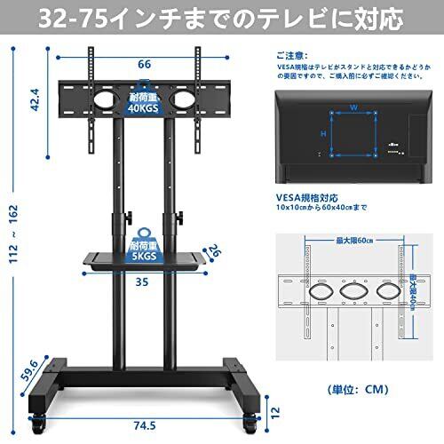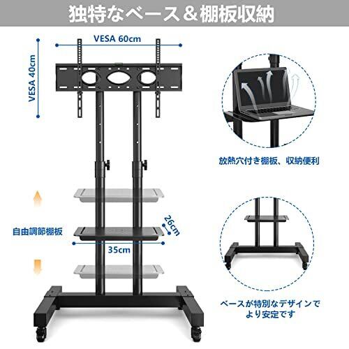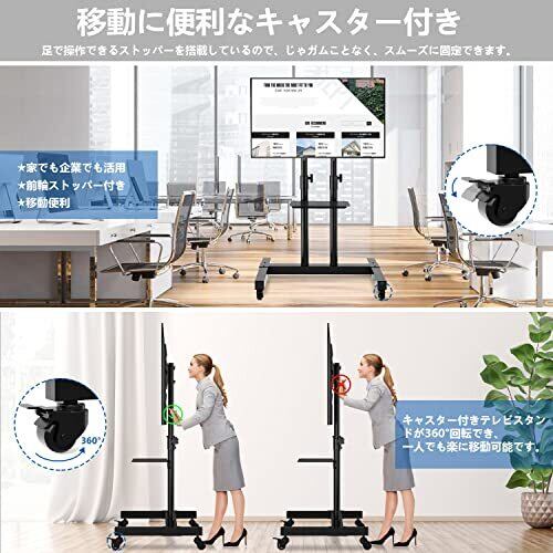 安定・移動便利 製品の安定性を高めるために、キャスター付きテレビスタンドは丈夫な鋼鉄で作られ、柱も2本で設計しております、耐荷重が40kg、テレビをしっかりとした取付けています。また、キャスターも軽くて360°回転できて、一人で楽に移動可能で、前輪には安全ストッパーを搭載して、足でスムーズに固定できて、移動しても使用しても便利です。