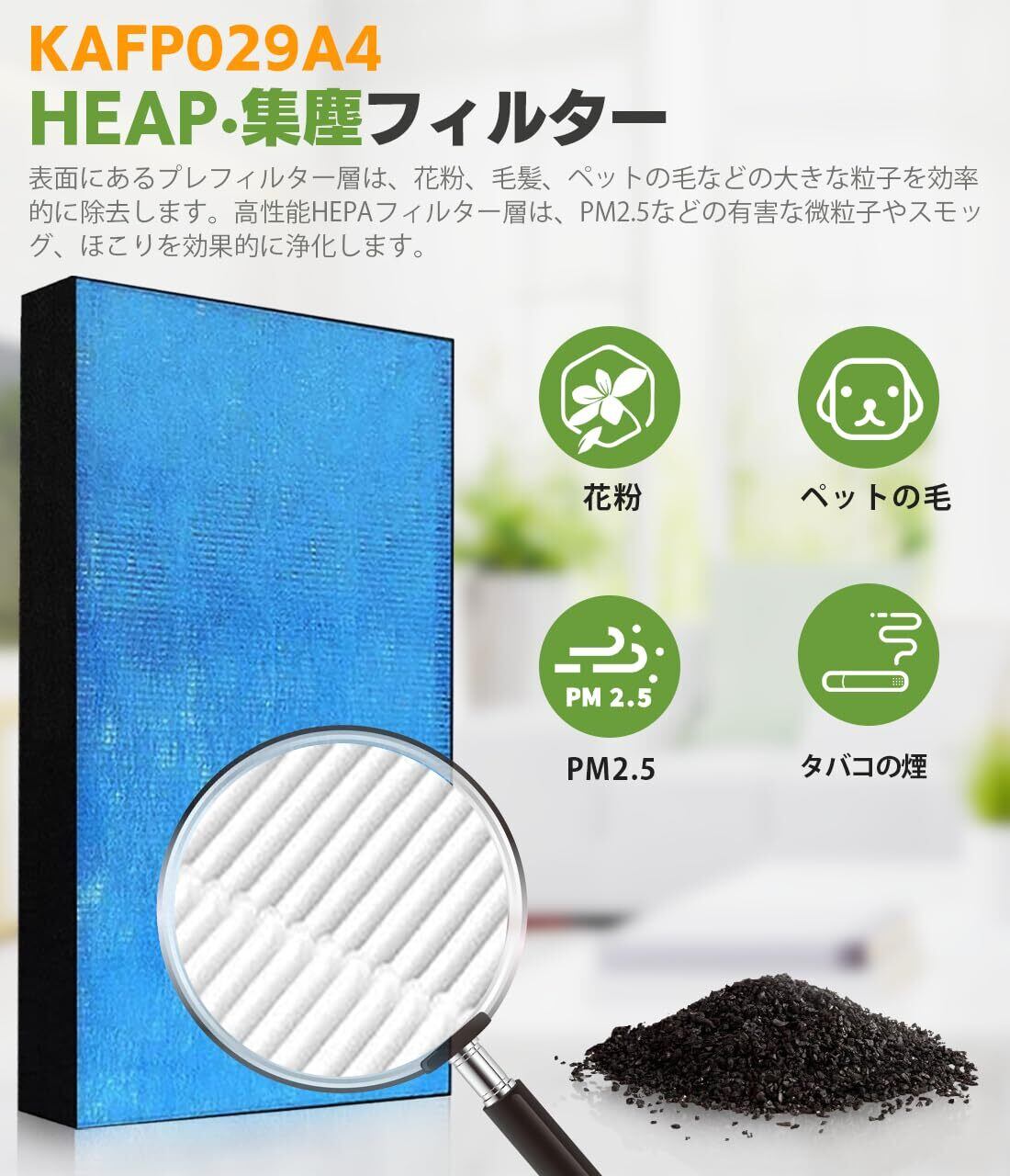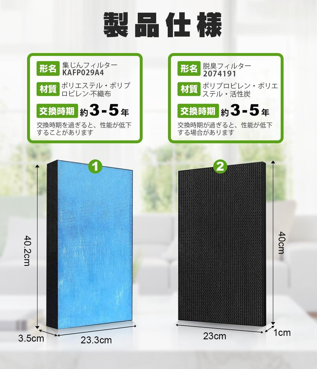 【仕様】対応品番:KAFP029A4&2074191(非純正品)。サイズ:HEPA集じんフィルター約402x233x35mm;脱臭フィルター約400x230x10mm;材質:不織布、脱臭剤、PP