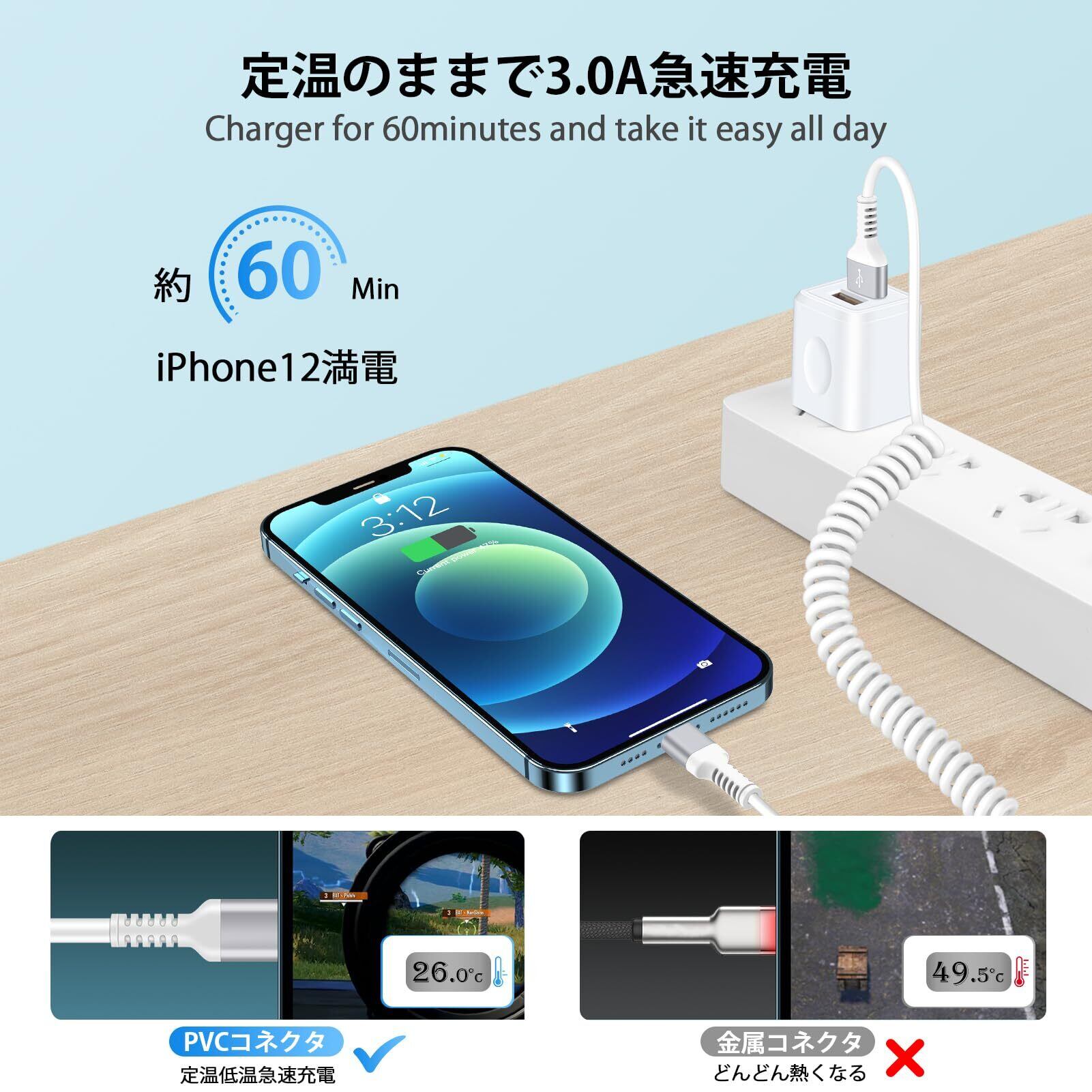 【耐久性】高品質TPU素材と耐久性と強度のある銅線を採用し、裂けるや結びることがありません。耐久性、柔軟性を備えて、最大20000回以上の曲げます。車の携帯電話ホルダーを使用すると、スマホとの接続は伸びながら使用すことができます。耐熱端子を使用し、断線、コネクタの接続不良、充電中の発熱などありません。