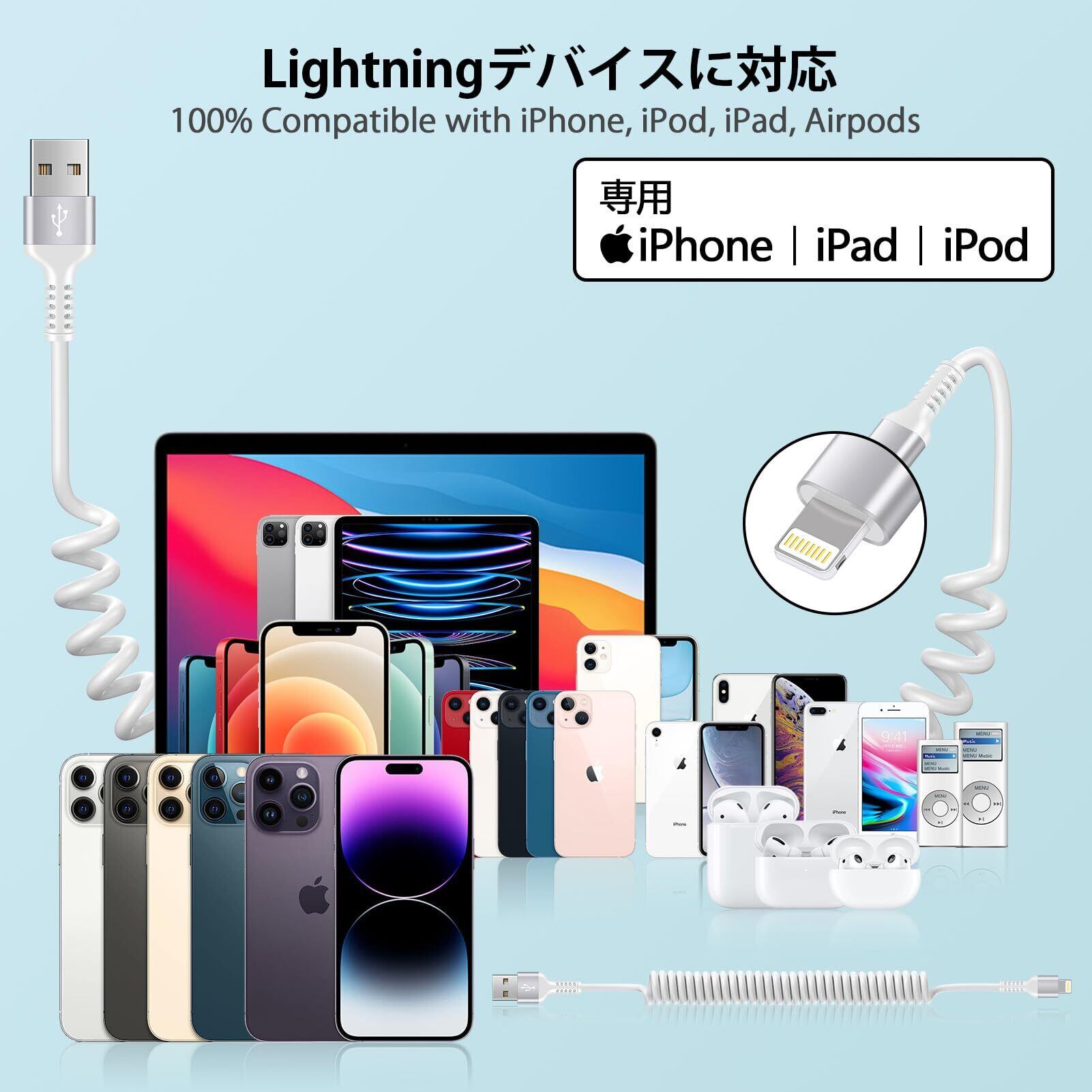 【品質保証】ライトニング伸縮ケーブル*1本、12ヶ月以内に無償交換或いは返金します。 iPhone/iPad/AirPods/Carplayなどに対応。注:CarPlay機能に問題が発生した場合は、CarPlayに接続する前に、コイル型iPhone充電ケーブルを再挿入し、Lightningコネクタを逆にしてみてください。さらにご質問がある場合は、お気軽にお問い合わせください。