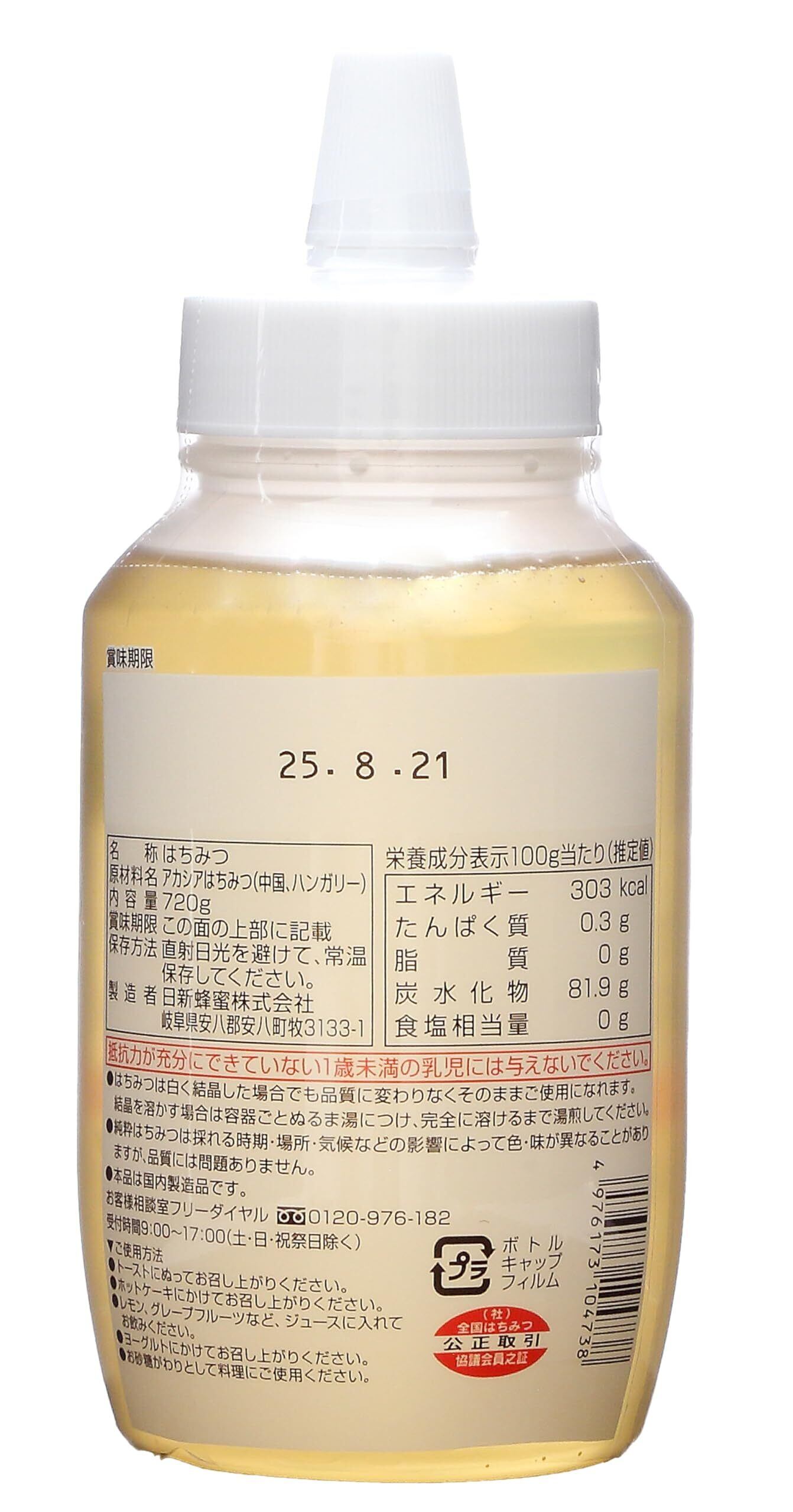 抜群の透明感とすっきりとした爽やかな甘さが特徴です。厳選した中国産とハンガリー産のアカシアはちみつをブレンドしました。