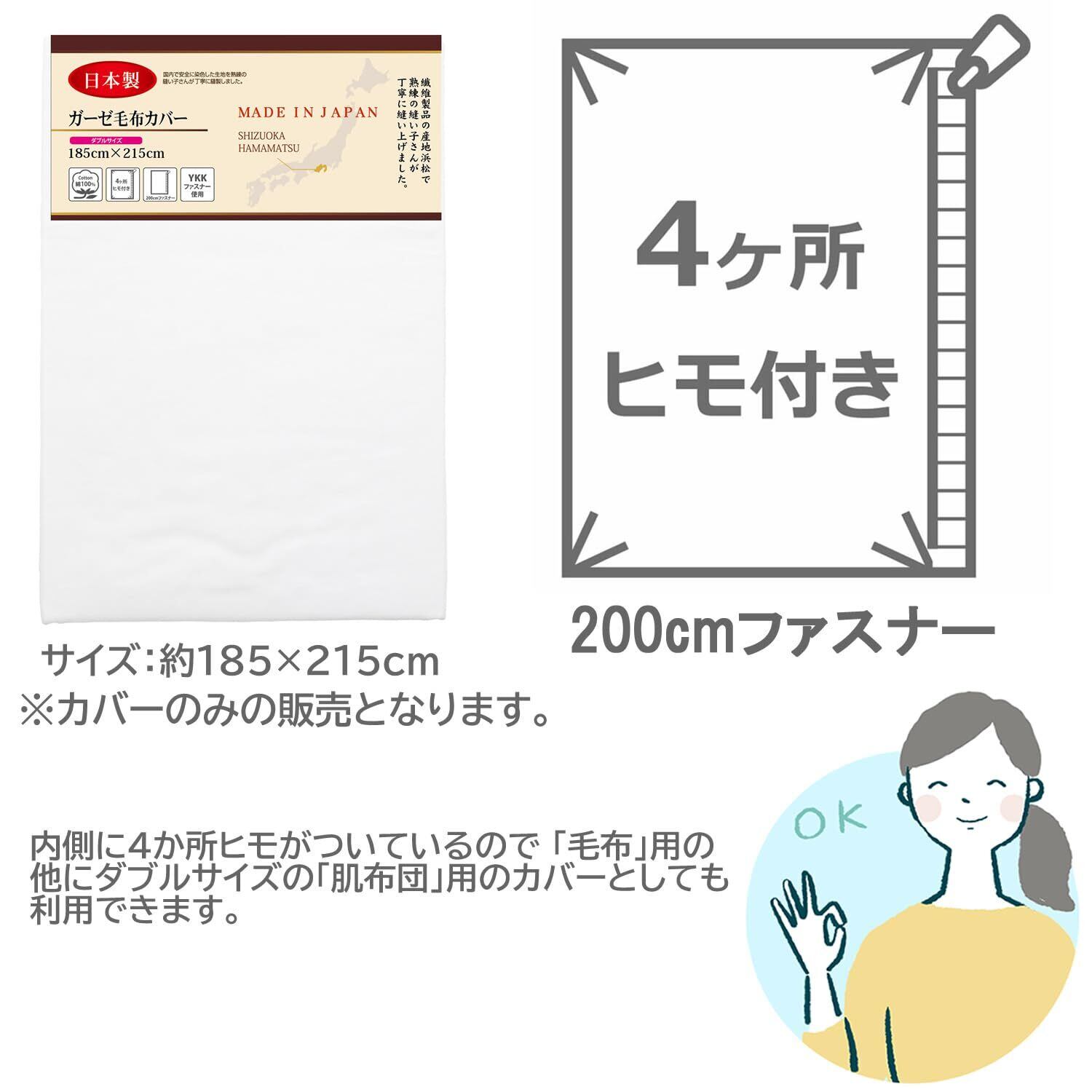サイズは185×215cm、内側に4か所ヒモがついているので 「毛布」の他にダブルサイズの「肌布団」用のカバーとしても利用できます。※両面とも片側にハギ(生地の継ぎ目が入ります。)