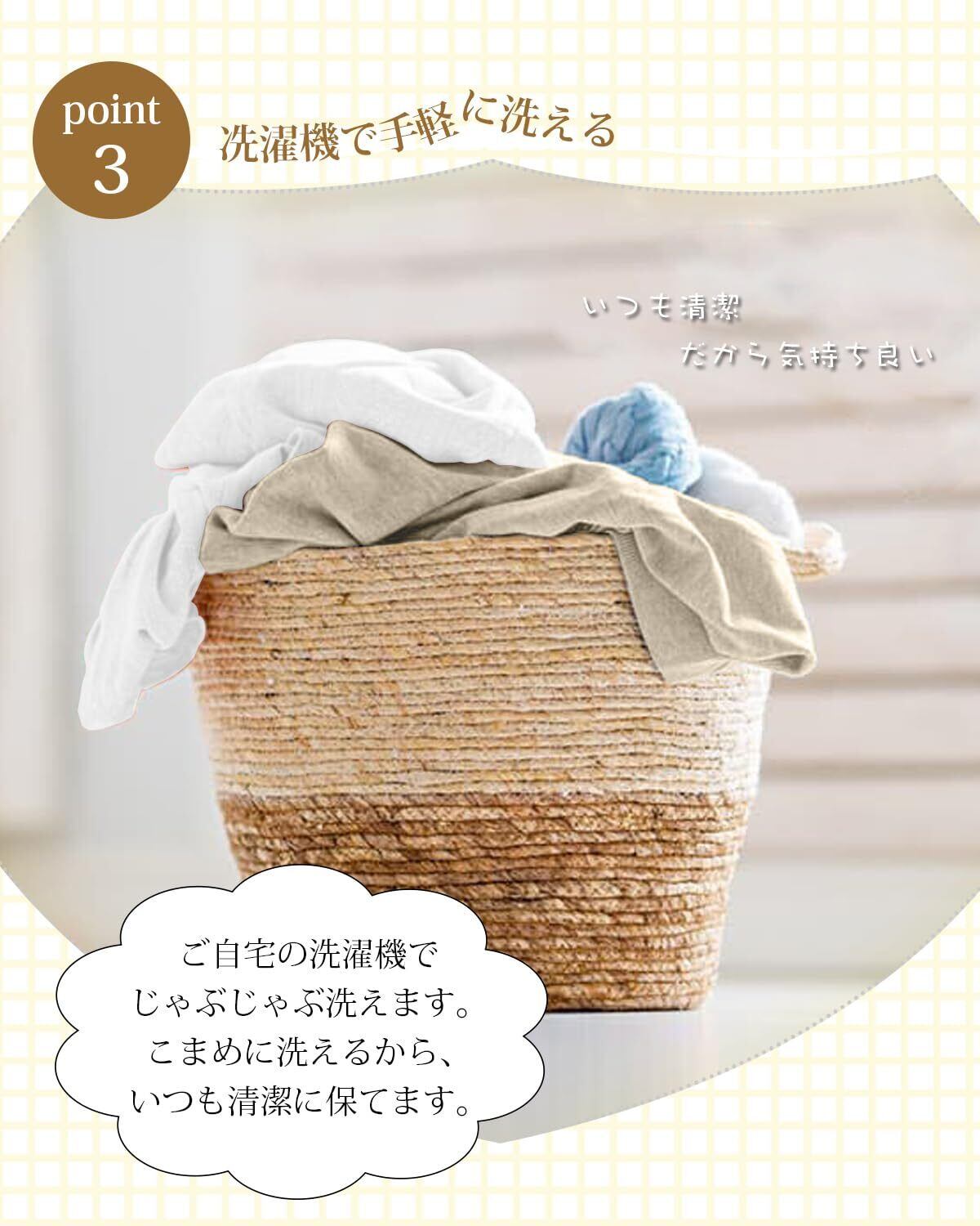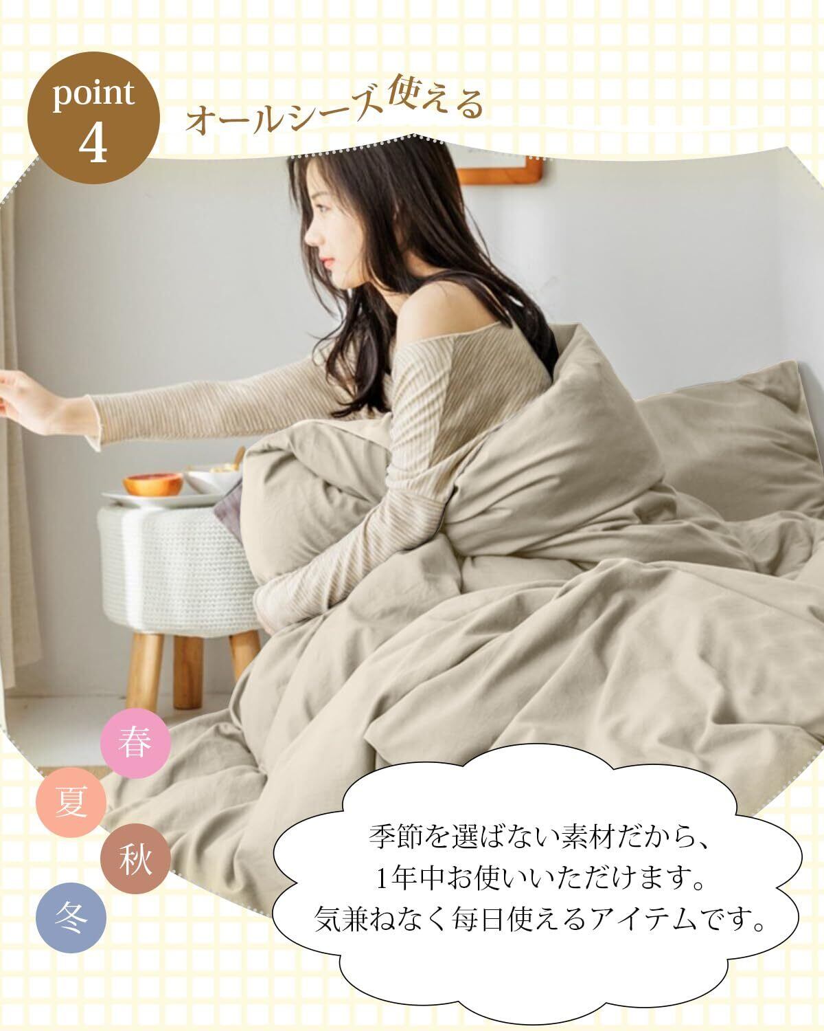 高密度生地·オールシーズン快適」高密度織りの生地を厳選して、丁寜な縫製で長期間の使用にも耐える顽丈な仕上がりです。通気性が良くて、吸湿性と保温性に優れていることから、年間を通して快適な生地です。洗いさらし加エによって、生地の良い特性を保ちながら、縮みやすいデメリットも改善できるようになります。
