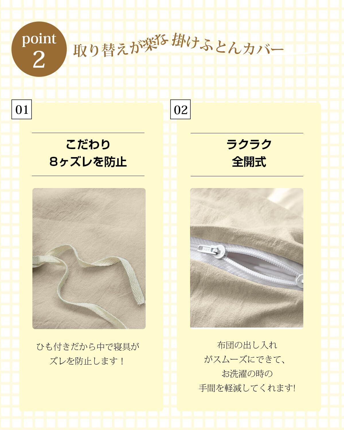 「全開·両開きファスナー式」ファスナーは取手が2つついたダプルスライダータイプのため、掛け布団の着脱もスムーズです。それに、どのサイズもズレ防止用の紐がそれそれ8箇所(4隅、4边の中央)についています。布団とカバーをしっかり固定できて、寝具がズレることなく快適に使える。