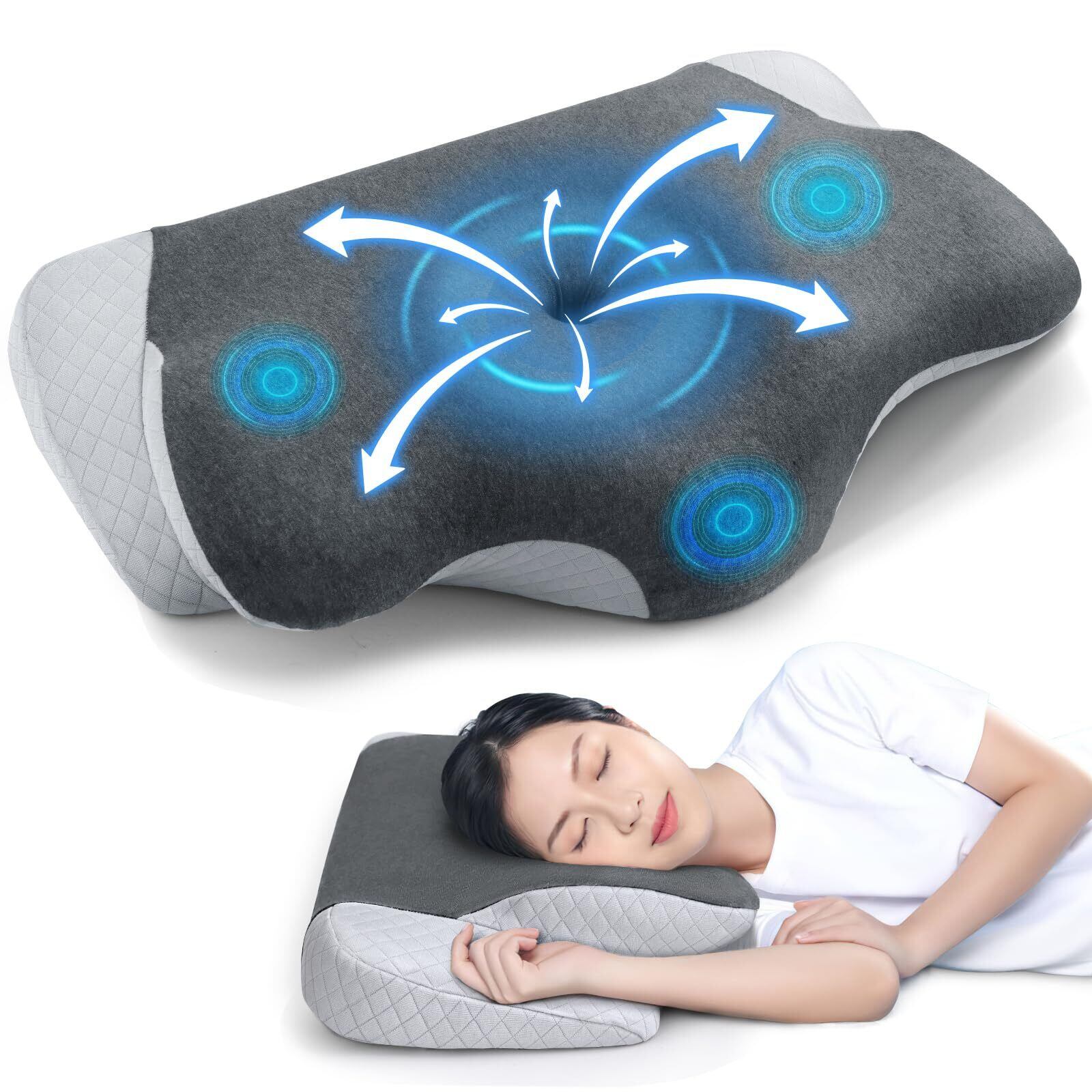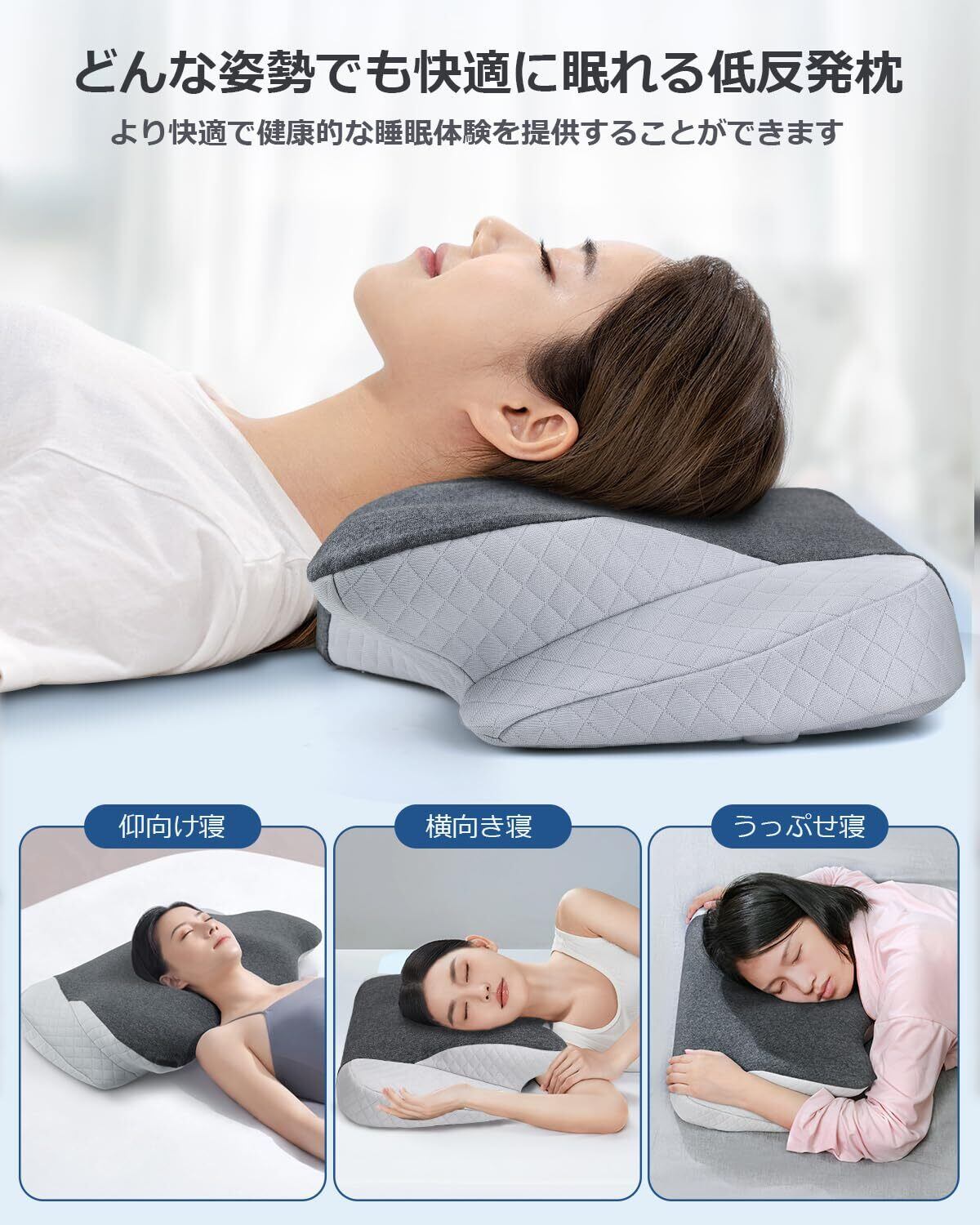 【良い睡眠体験を実現する高さ調節可能】枕は体型に合わせて使えるように設計されています。低めの側が6.5cm、高めの側が8.5cmの2段階高さ調節が可能です。高めの枕が好みの方にも、低めの枕が好みの方にもご利用いただけます。耳と後頭部の凹型中空設計と両側の曲線でデザインされたこの枕は、首の自然な湾曲と背骨の自然な位置をサポートし、頭、首、肩をしっかりと優しくサポートします。※サイズ表記は実寸のため、多少の誤差が生じる場合がでさいます。予めご了承ください。