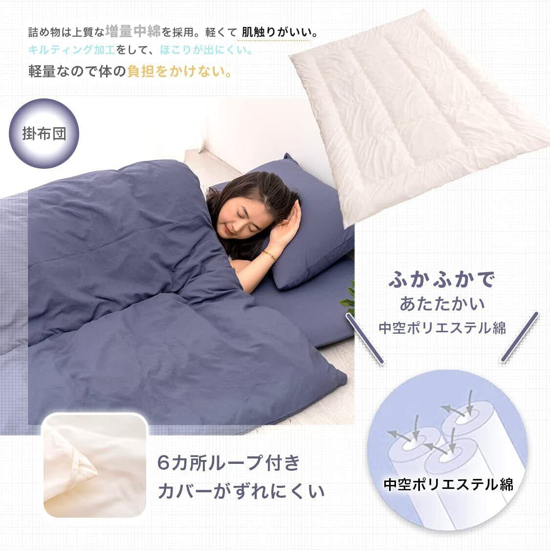 【掛け布団】サイズ:幅150×長さ210cm 側生地:ポリエステル100%(ピーチスキン加工) 詰め物:バージン綿100% 詰め物重量:1.2kg 6カ所ループ付き、カバーがずれにくい。詰め物は上質な増量中綿を採用。軽くて肌触りがいい。キルティング加工をして、ほこりが出にくい。軽量なので体の負担をかけない。
