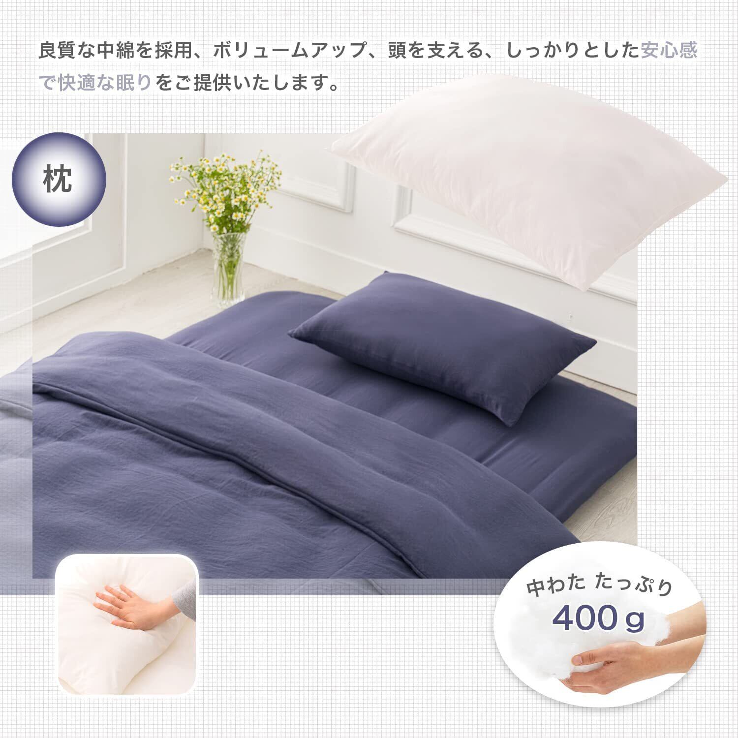 【枕】サイズ:幅63×奥行43cm 側生地:ポリエステル100%(ピーチスキン加工) 詰め物:バージン綿100% 詰め物重量:0.4kg 良質な中綿を採用、ボリュームアップ、頭を支える、しっかりとした安心感で快適な眠りをご提供いたします。