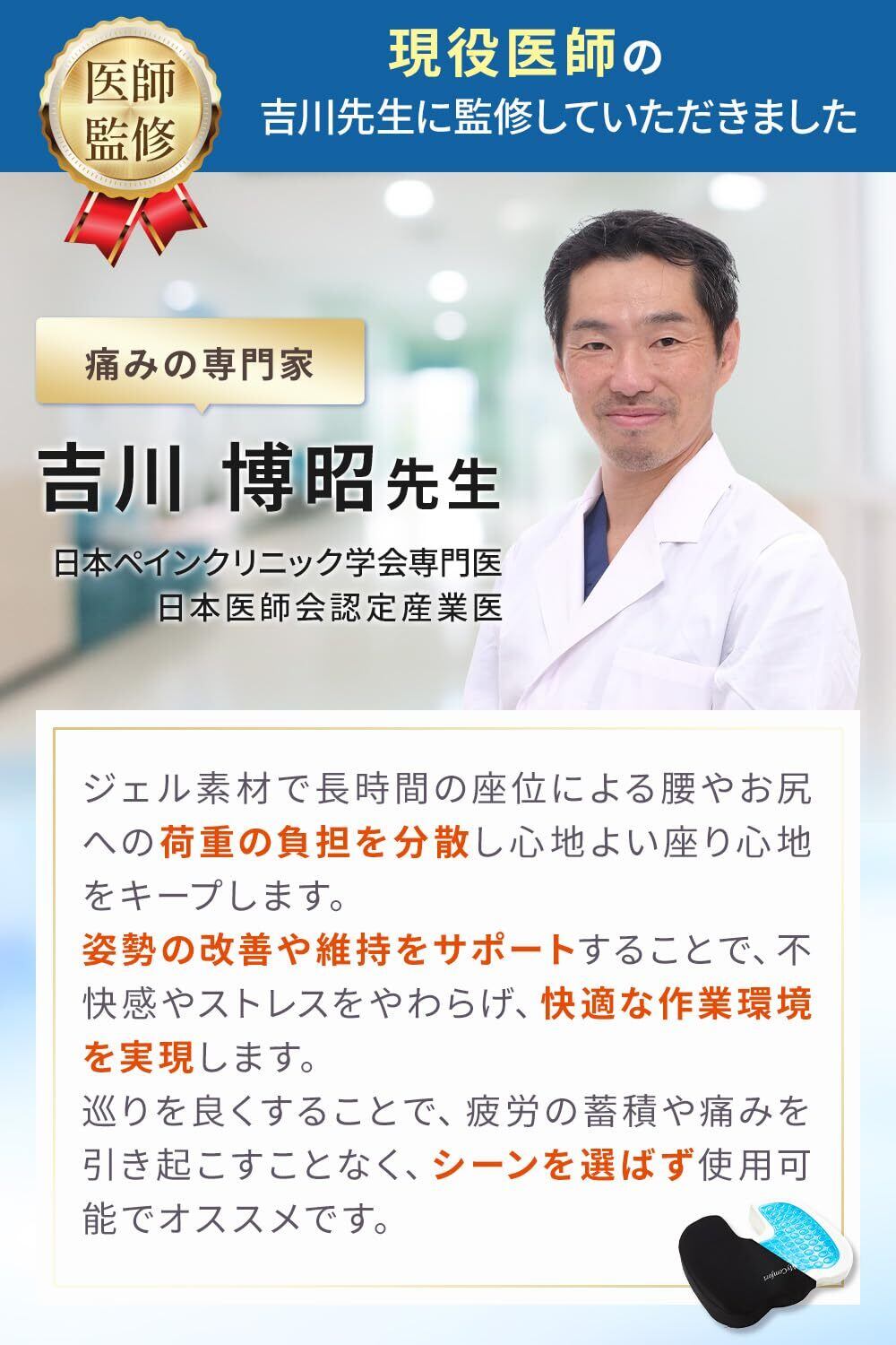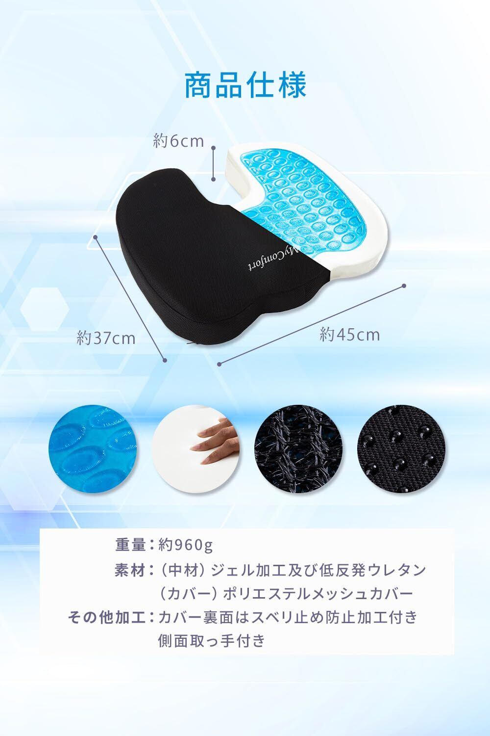 【MyComfort (マイコンフォート)とは?】マイコンフォートは2020年に創設された日本企業ブランドです。”手の届く、最高級の快適を。"というブランドコンセプトで皆さまに極上の快適をお届けいたします。設立わずか2年足らずで累計販売個数100万個突破(2023年1月31日時点)し、雑誌やメディア、著名人にも多く取り上げられております。 【商品仕様】商品サイズ:(約) 縦45cm*横37cm*高さ6cm、パッケージサイズ:(約)、重さ:(約)960g、素材:[クッション本体] 低反発ウレタンフォーム 及び ジェル加工素材 [クッションカバー] ポリエステル100%