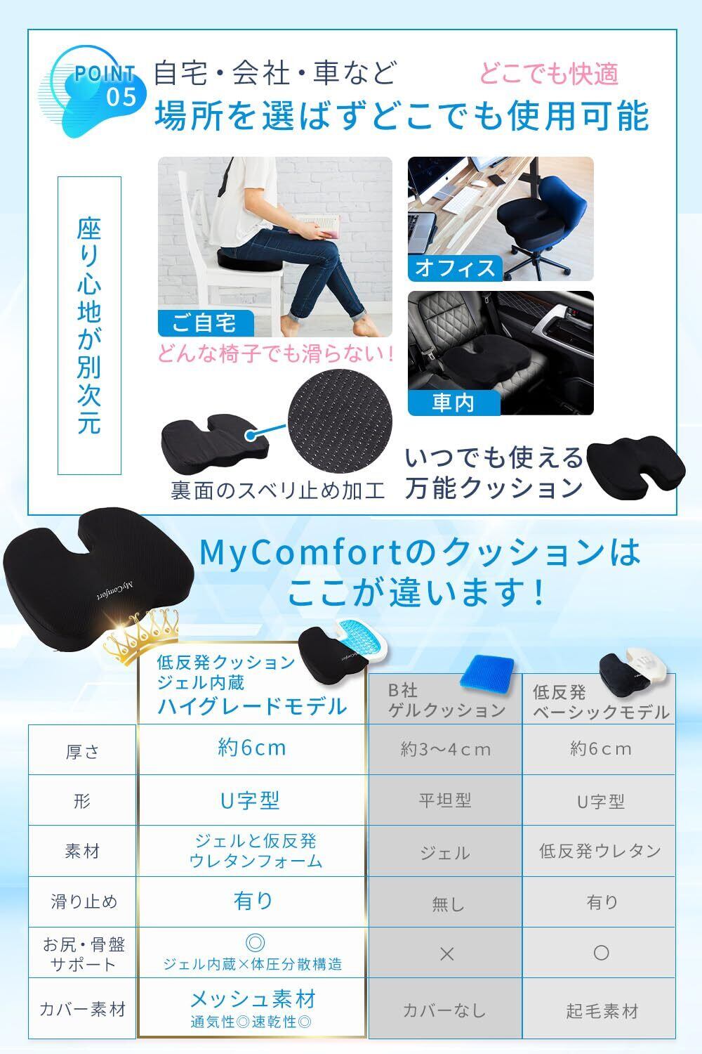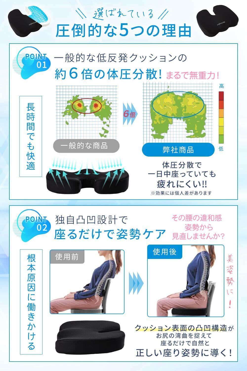 【他社との違いはクッション性】本製品はジェルと低反発のWクッション構造で設計し、長時間の”座り”に圧倒的な快適をお届けします。一般的な低反発クッションや座布団は、長時間座り続けると身体の重さによって徐々に沈んでいく傾向がありますが、MyComfortの低反発クッションはそんな課題に忠実に向き合い、底づき感(クッション・座布団が潰れてお尻が床についてしまう感覚)をなくし、皆さまに喜ばれるクッションの開発に成功いたしました。 【圧倒的な品質基準】年間数百万個以上の生産能力を有し、厳しい品質基準をクリアしたISO取得工場で生産しております。圧倒的なクッション性と品質レベルを今すぐ実感してみてください。