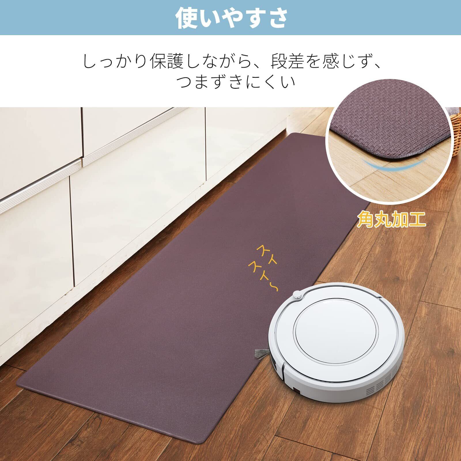 【しっかり滑り止め効果】裏面には滑り止め加工が施されており、床面に密着してずれにくい。安定して料理をすることができます。四隅がつまずき防止の角丸仕様:足元の引っかかりによってめくれやすい角を丸くカット。反り返りを防ぎ、快適にお使いいただけます。