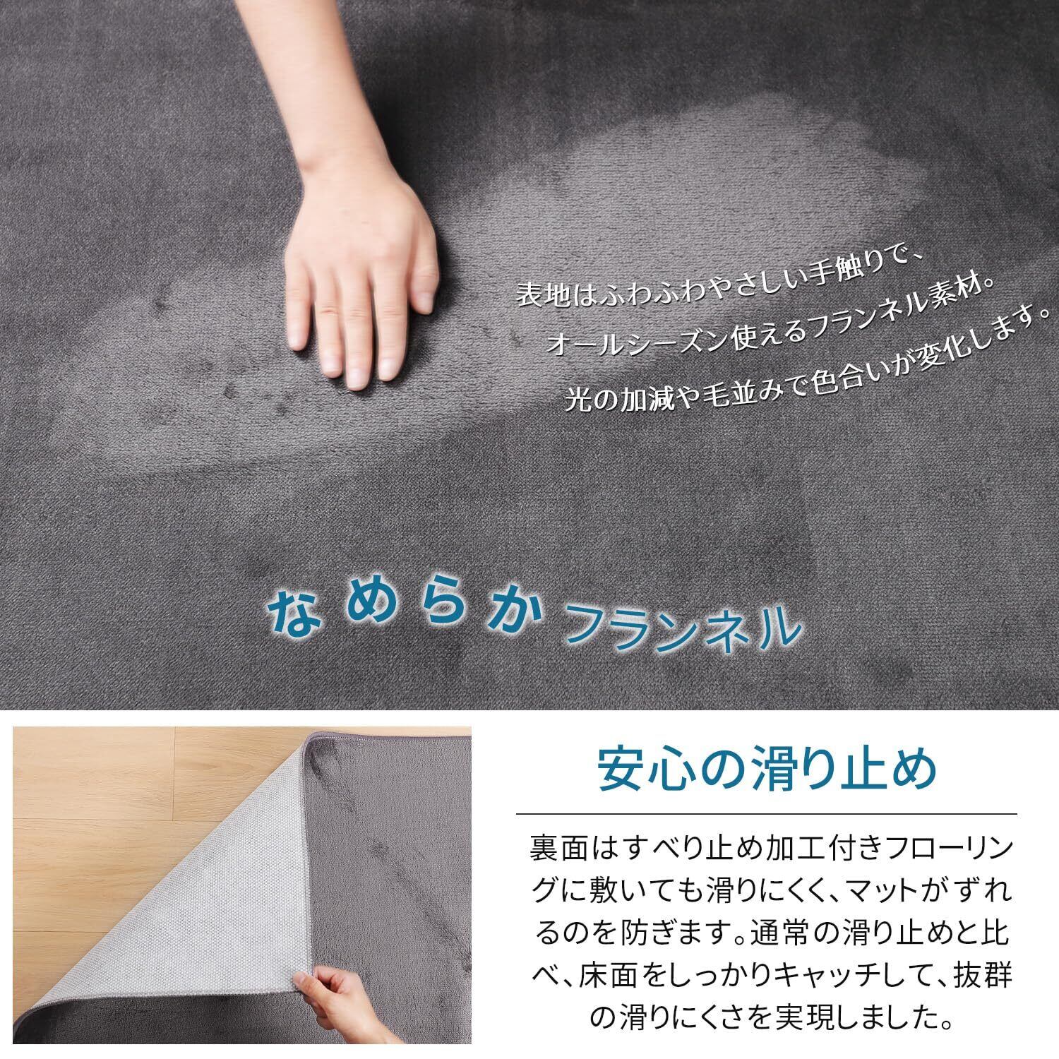 「さらふわ・フランネルキッチンマット」さわり心地が抜群に気持ちいいフランネル生地を使用、しっとり&ふわふわの極上の感触。●毛足の向きによって色の見え方が変わるのもフランネルキッチンラグの特徴。光や見る角度の違いで様々な表情を見せてくれます。●裏面にはキッチンマットのズレを解消するのが、接着剤不使用で複数の滑り止め付き。 何度洗濯してもすべり止め効果はそのまま。滑りやすいフローリングに設置できます。