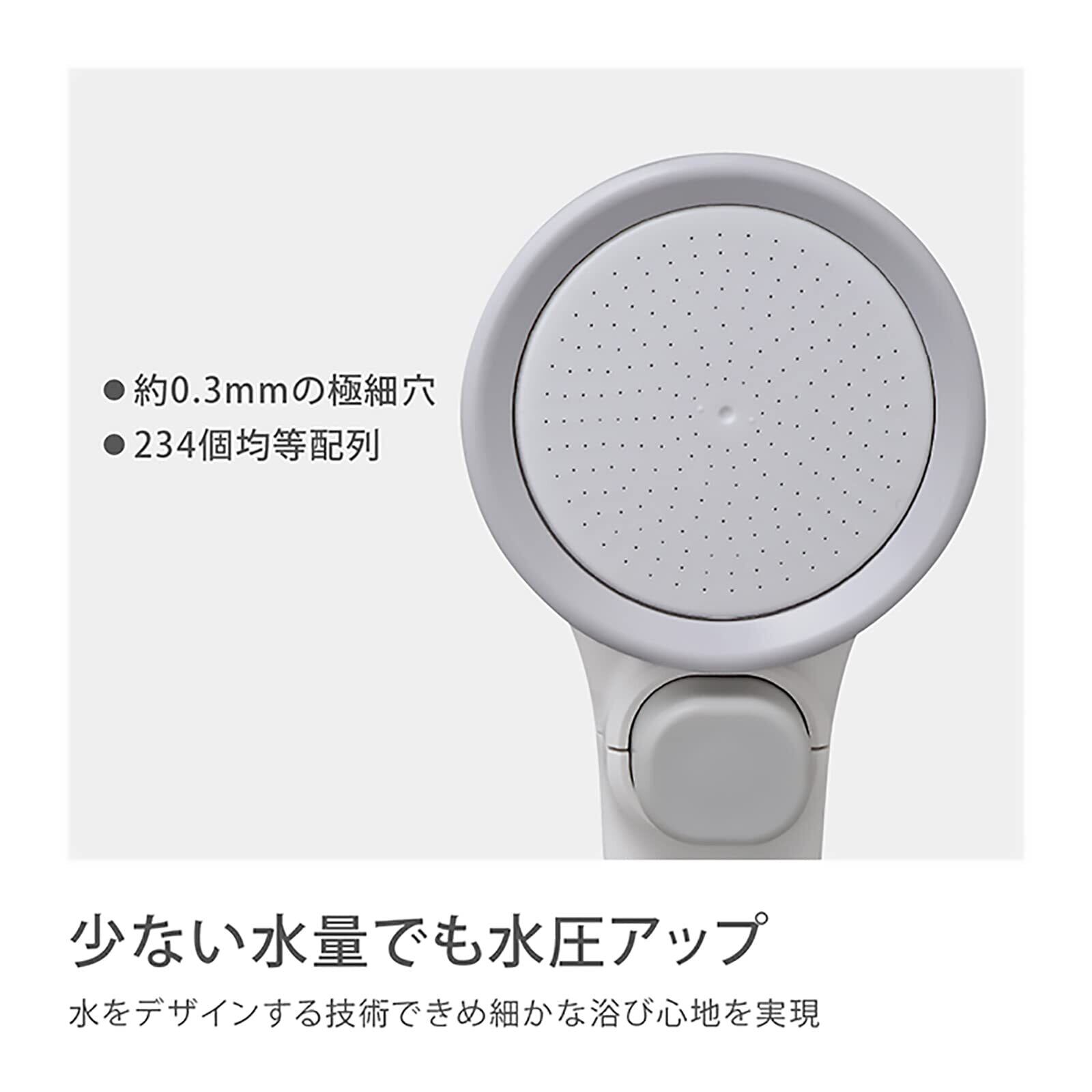 約0.3mmの細い水流と均等配列した高密度なやわらかい肌あたりで、浴びたいところに水流を集中できる水幅スリムなシャワーです。
