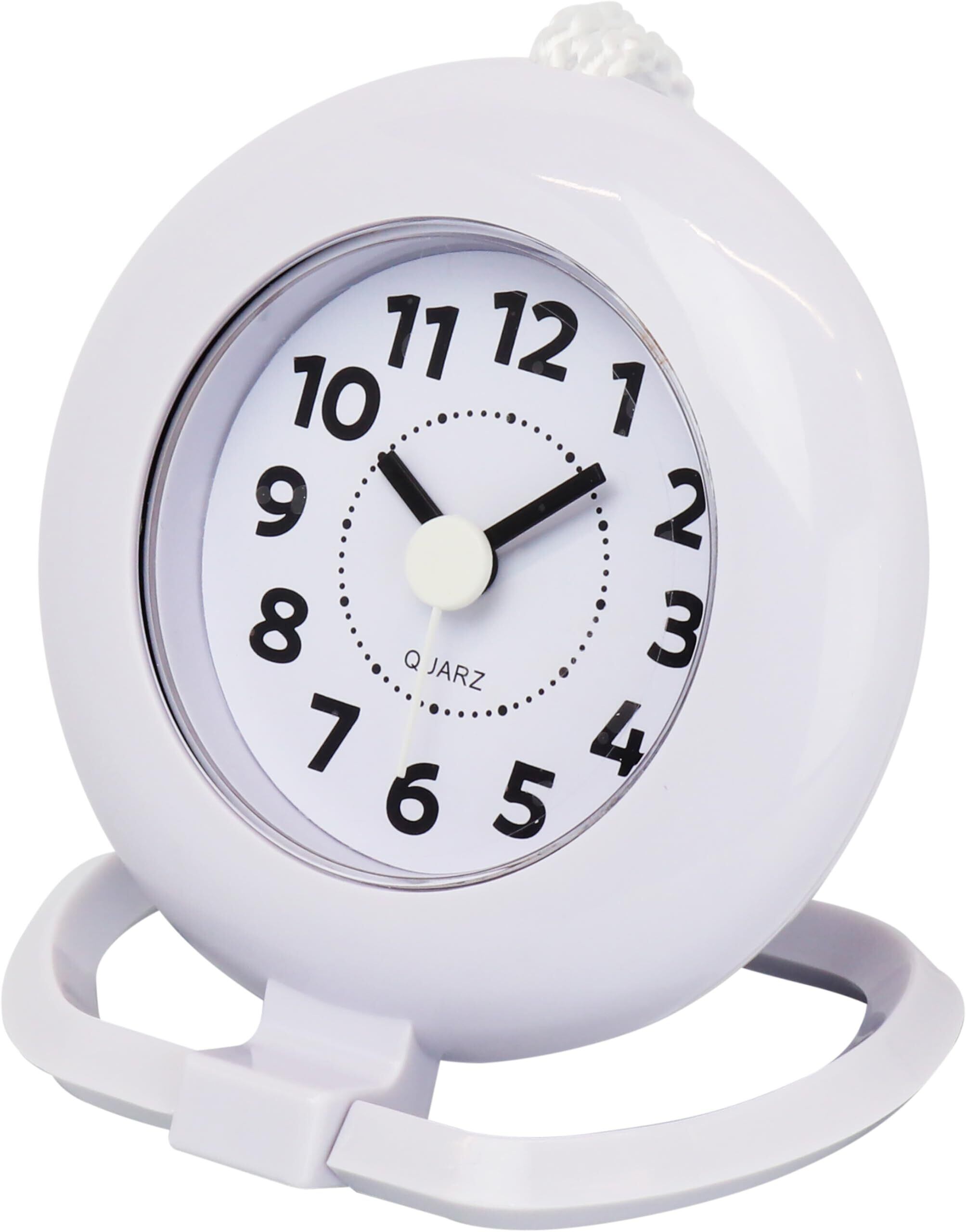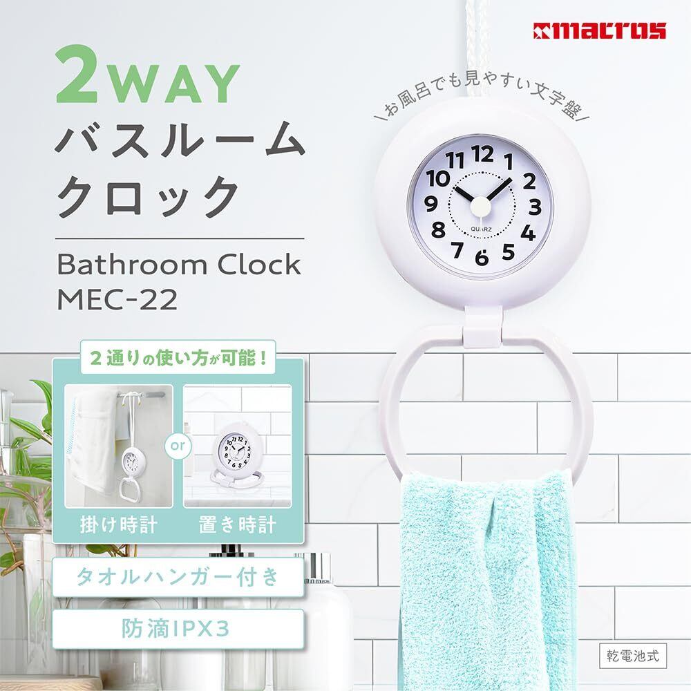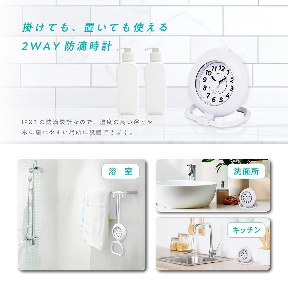 掛け時計/置き時計の2通りの使い方が可能な、IPX3防滴時計です。 タオルハンガー付きで、お風呂場や洗面所、キッチンでも使用可能です。