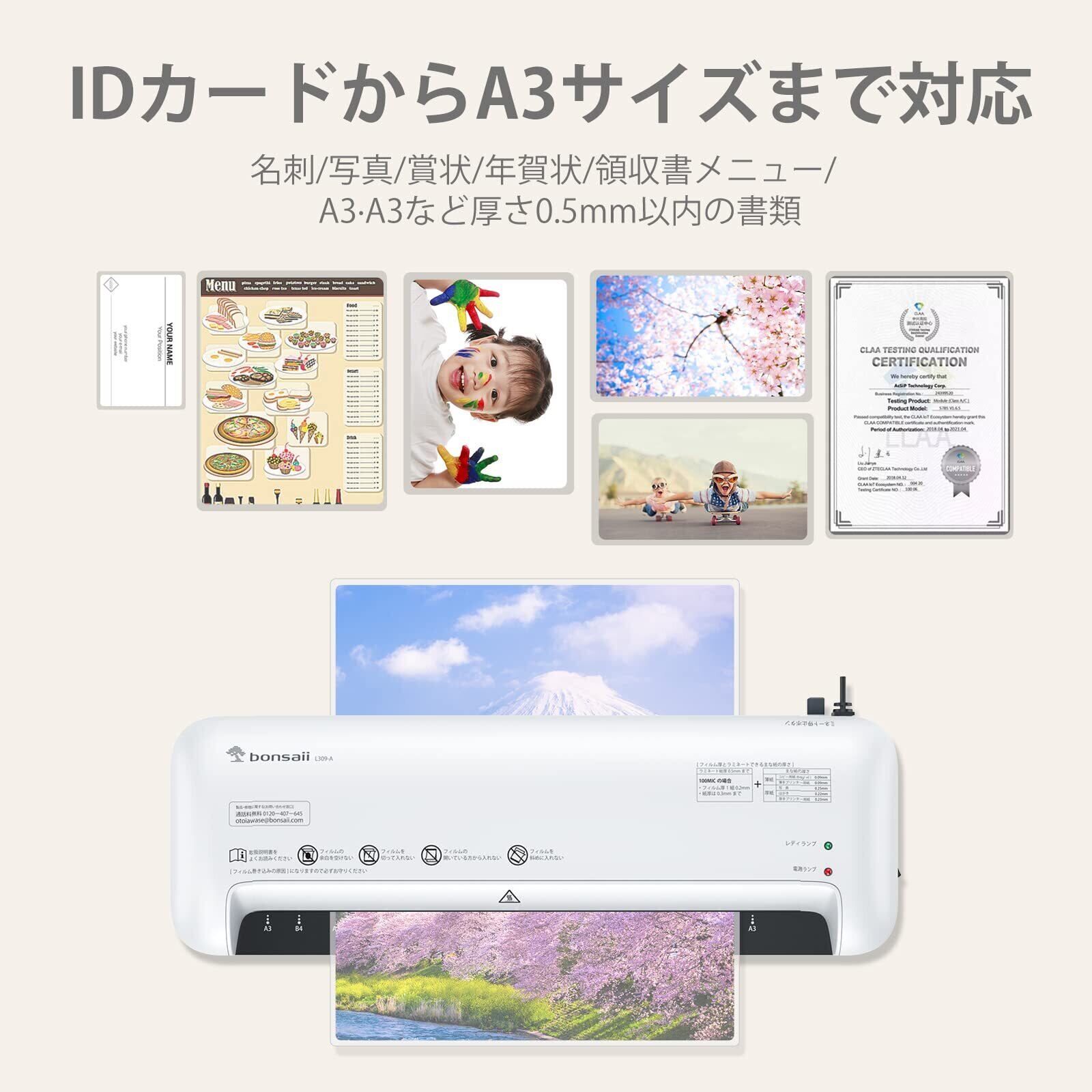 bonsaii ラミネーター A3/A4/B5/はがき/名刺サイズ対応 80/100μmフィルム対応 ウォームアップ時間3-4分 気泡なし 波打防止 簡単操作 家庭用 業務用 軽量 3点セット【PSE認証済】ホワイト L309-A