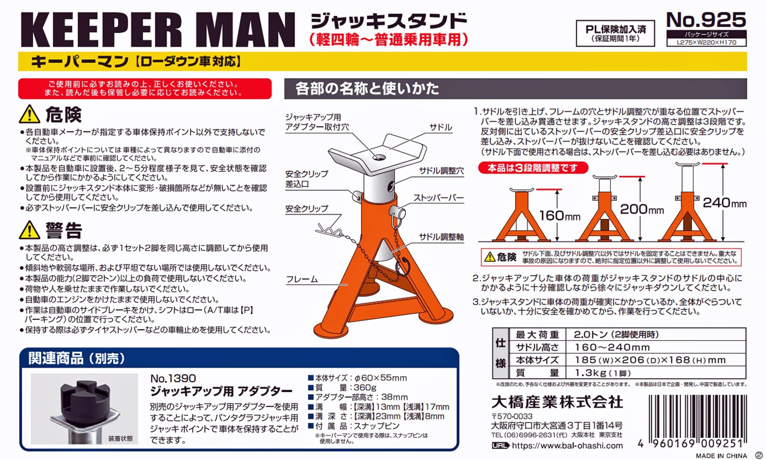大橋産業(BAL) ジャッキスタンド キーパーマン 2t 925【ローダウン車対応】 ■ローダウン車に対応 ■サドルの高さを160mmから240mmまで3段階に調整することができます。 ■本体は視認性の高いオレンジ色で安全作業 ■2脚入 ■別売のジャッキアップ用アダプターをサドルのジャッキアップ用アダプター取付穴に取り付けることによって、パンタグラフジャッキ用ジャッキポイントで車体を保持することができます。 ■PL保険加入済(保証期間1年)