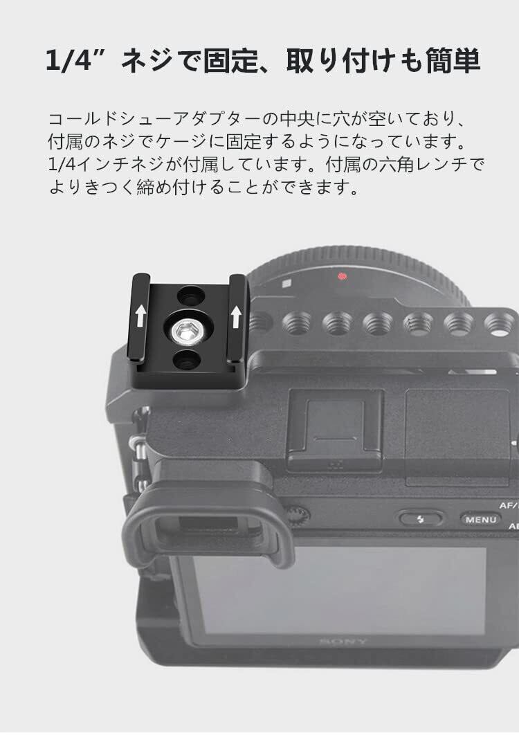 【取り付けも簡単】コールドシューマウントの中央に穴が空いており、付属のネジでケージに固定するようになっています。1/4インチネジとM2.5ネジが付属しています。付属の六角レンチでよりきつく締め付けることができます。アダプターの矢印で示された方向にアクセサリを取り付けてください。