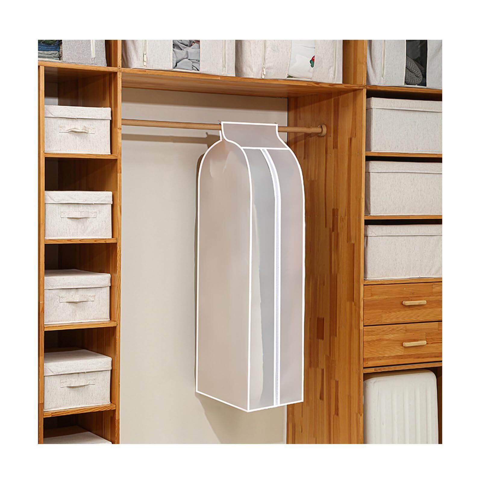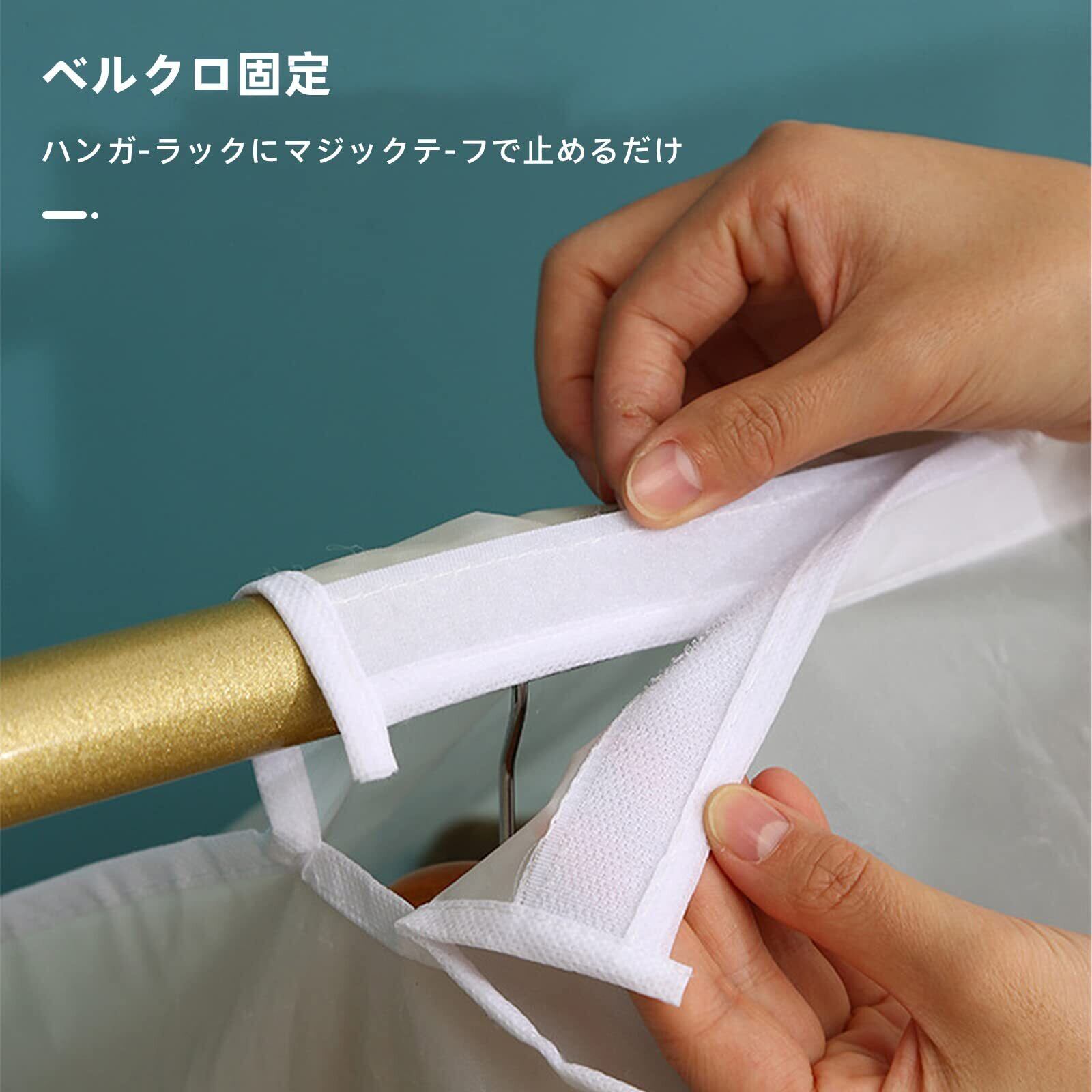 【優れた防塵性能のPEVA材質】 ホコリや汚れをしっかり防ぐ防塵素材。ペットの毛や部屋のほこりから服を守ります。不織布カバーよりも防塵性能が高く、大切な衣類をきれいに保管できます。汚れの侵入を最小限に食い止めるため、ハンガー穴は小さめにし、底部分を縫い合わせました。