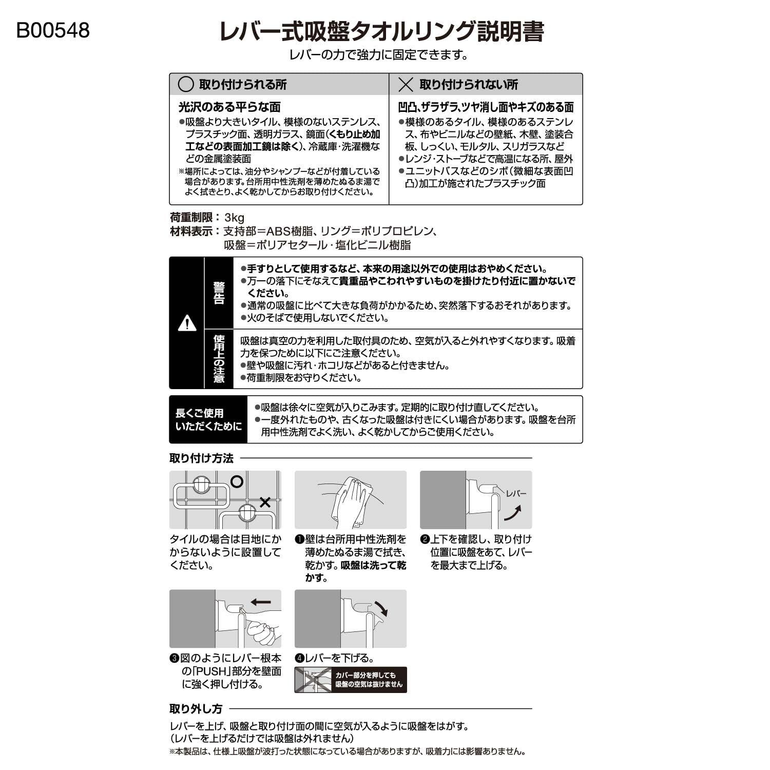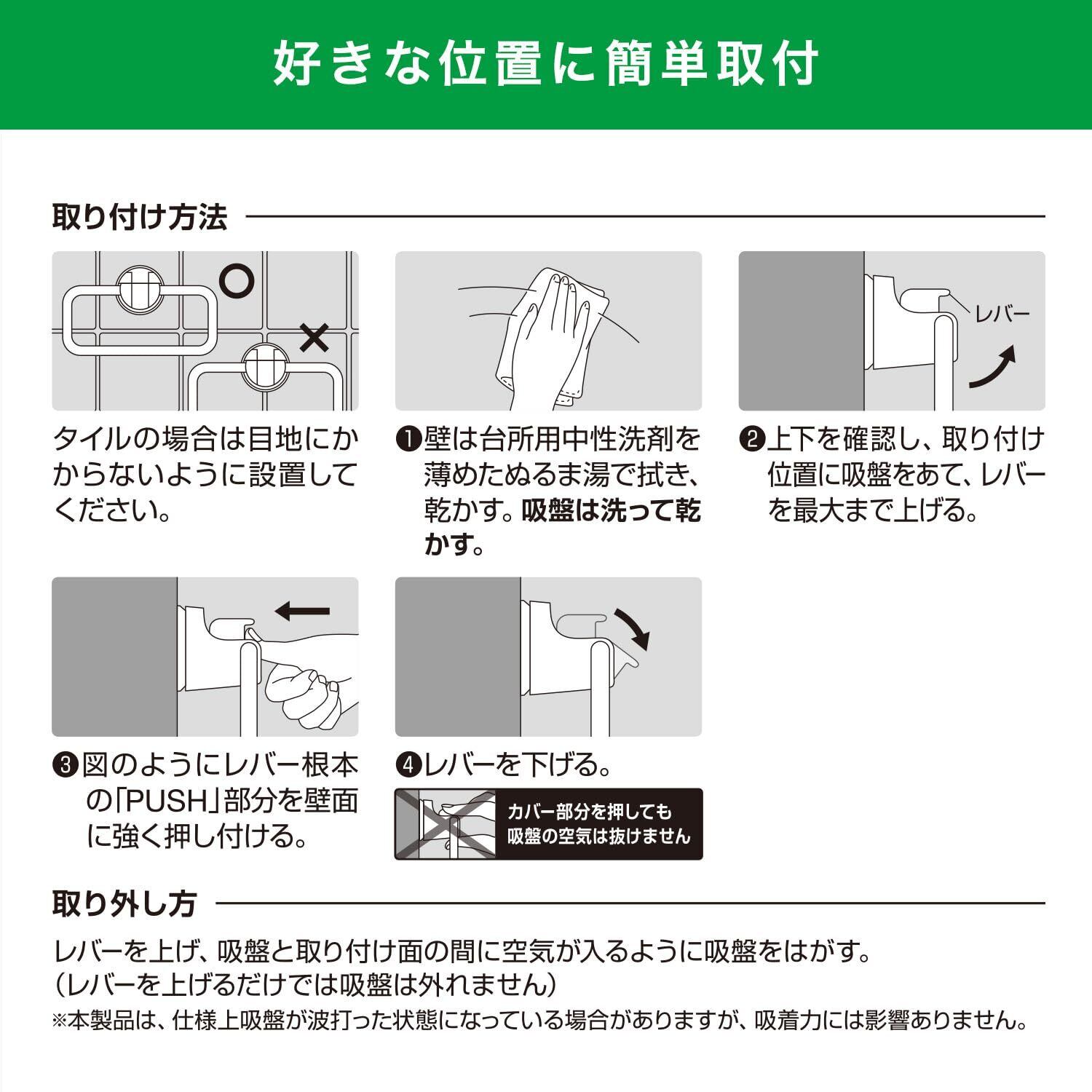 ・吸盤より大きいタイル、模様のないステンレス、プラスチック面、透明ガラス、鏡面(くもり止め加工などの表面加工鏡は除く)、冷蔵庫・洗濯機などの金属塗装面