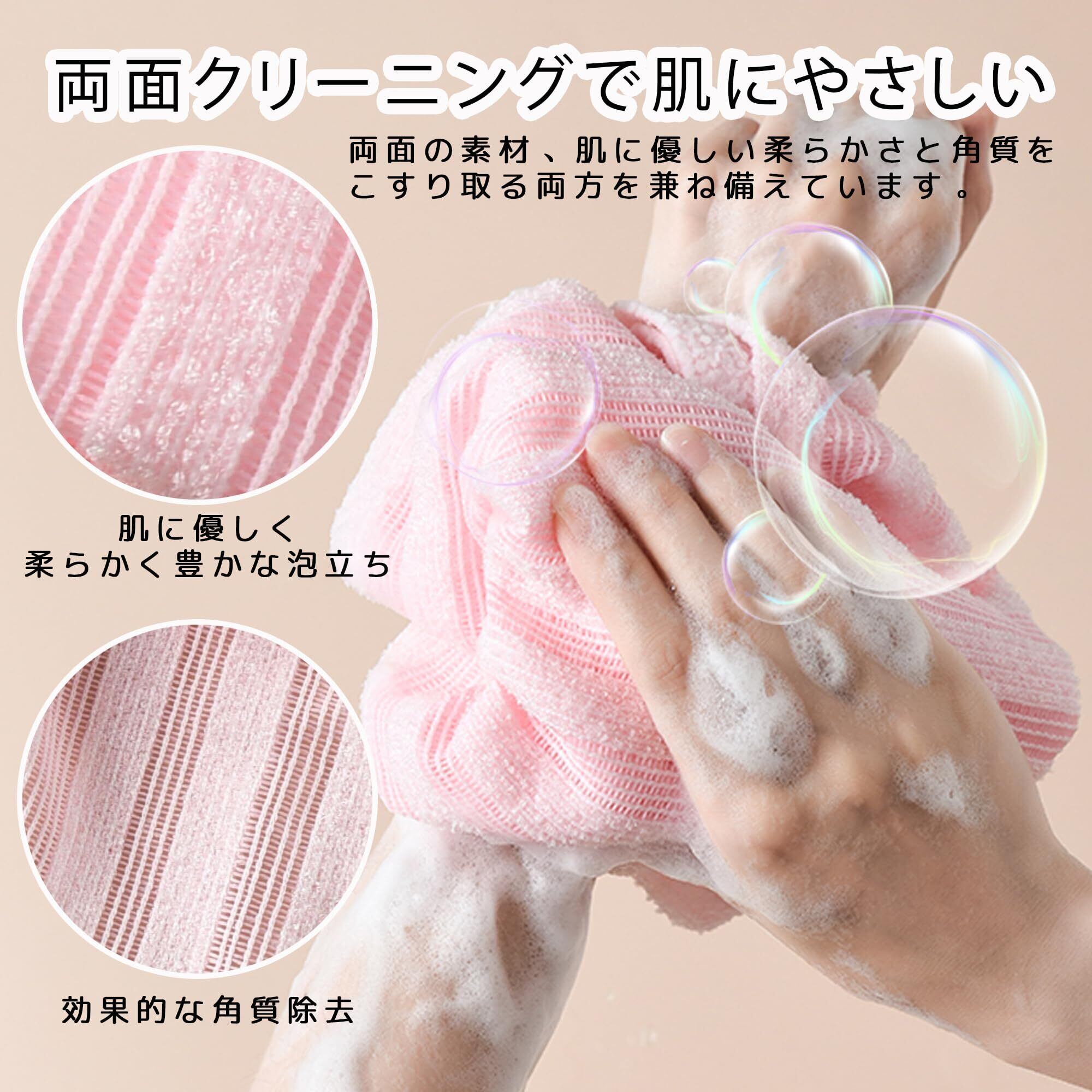 【高品質素材】ボディタオルは柔らかい生地で作られており、滑らかな触感、優しい肌触り、快適な使用感があります。少量のボディーソープでもすぐに泡立ち、体を洗うのが更に簡単になります。