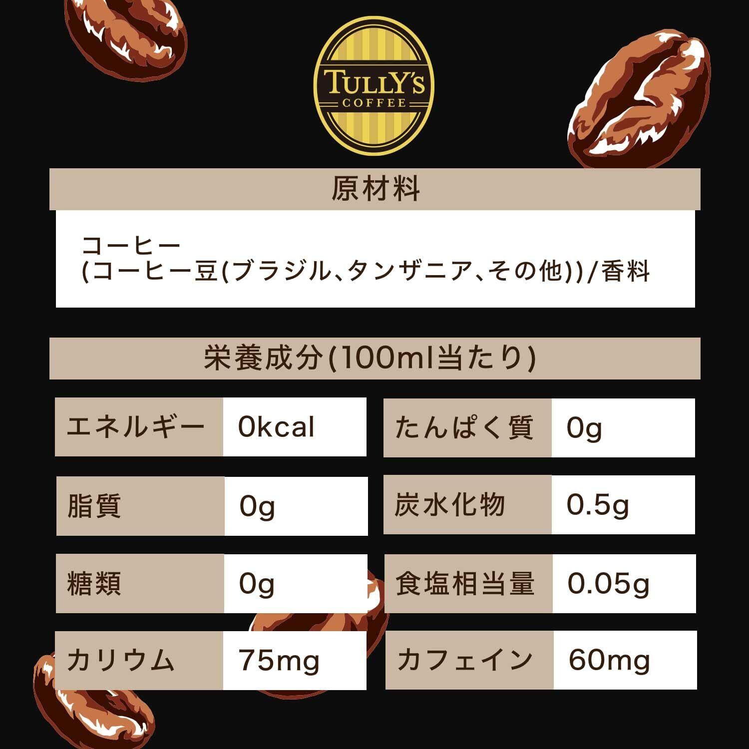 栄養成分(100ml当たり):エネルギー 0kcal、たんぱく質 0g、脂質 0g、炭水化物 0.5g (糖類 0g)、食塩相当量 0.05g、カリウム 75mg、カフェイン 60mg