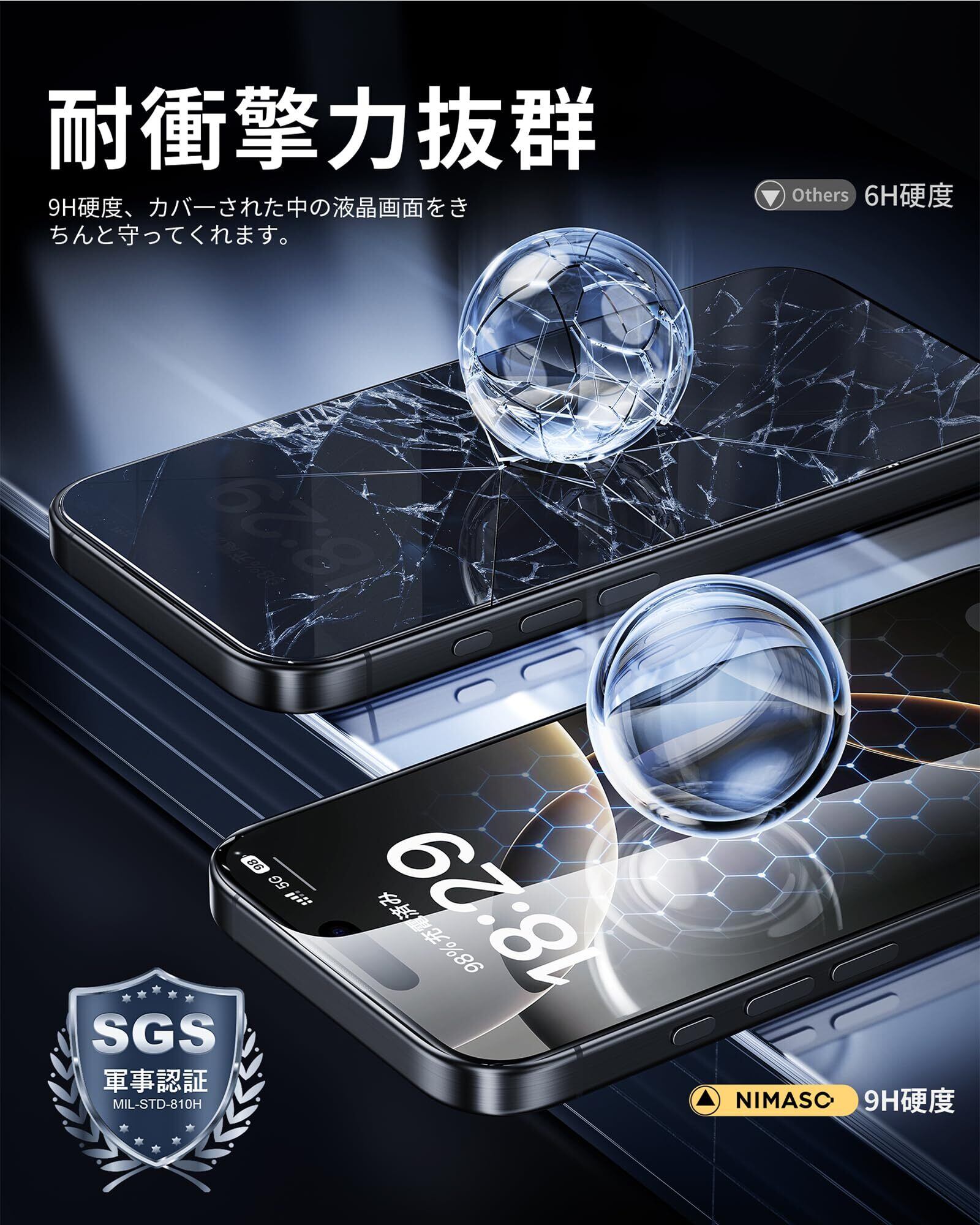 「9H硬度・飛散防止」米軍規格「MIL-STD-810H」に準拠(認証番号:SZXEC23002005001)。9H硬度のガラスを採用。小刀や鍵などの鋭いものにぶつかっても傷が付きにくく、あいふぉん16ぷろをしっかり保護します。飛散防止加工により、万一割れてもガラス破片が飛び散ることなく安心です。