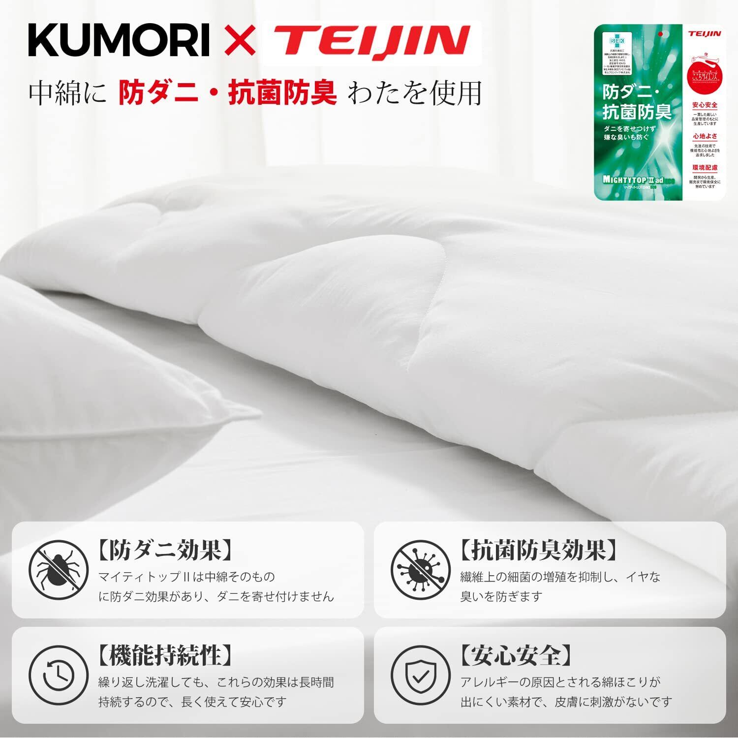 【抗菌・防臭・防ダニ】中わたには、防ダニ・抗菌・防臭性に優れた帝人「マイティトップII」を50%使用。細菌の繁殖を抑制して嫌な臭いを防ぎ、ダニを寄せ付けません。