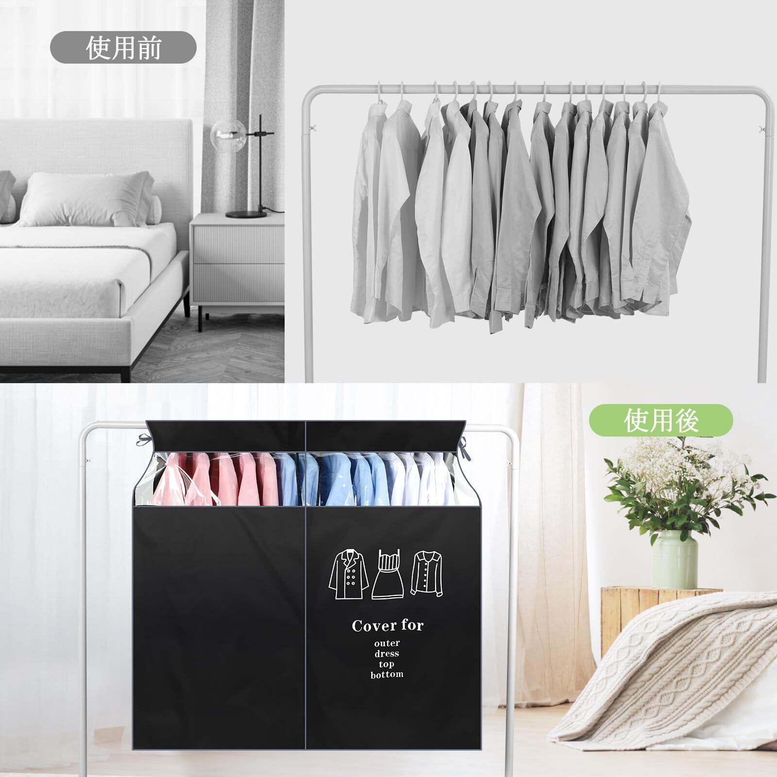 【仕様】サイズ:幅90cm*110cm高さ。ハンガーラックをすっかりカバーできるので、ベッドルーム、ベランダ、洋服ラックなど場所には使用できます。