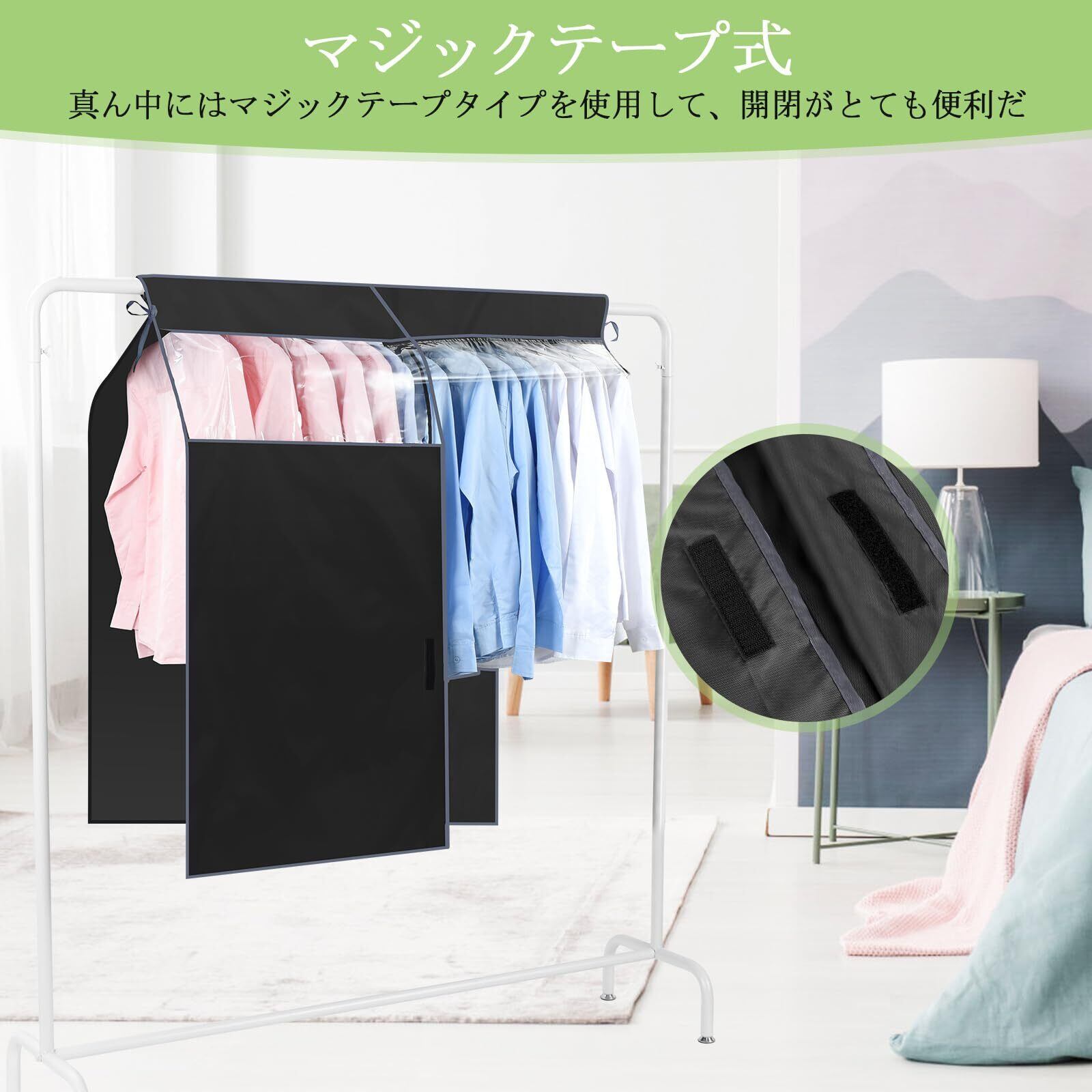 【マジックテープ開閉】ハンガーラックカバーの真ん中にマジックテープ付き、開閉がボタンタイプのより便利です。日常服や制服、スーツなどをパイプハンガーに掛け、そしてカバーを覆うと何日が経っても汚れないし、服を取るや掛けるのも邪魔なしで行えます。