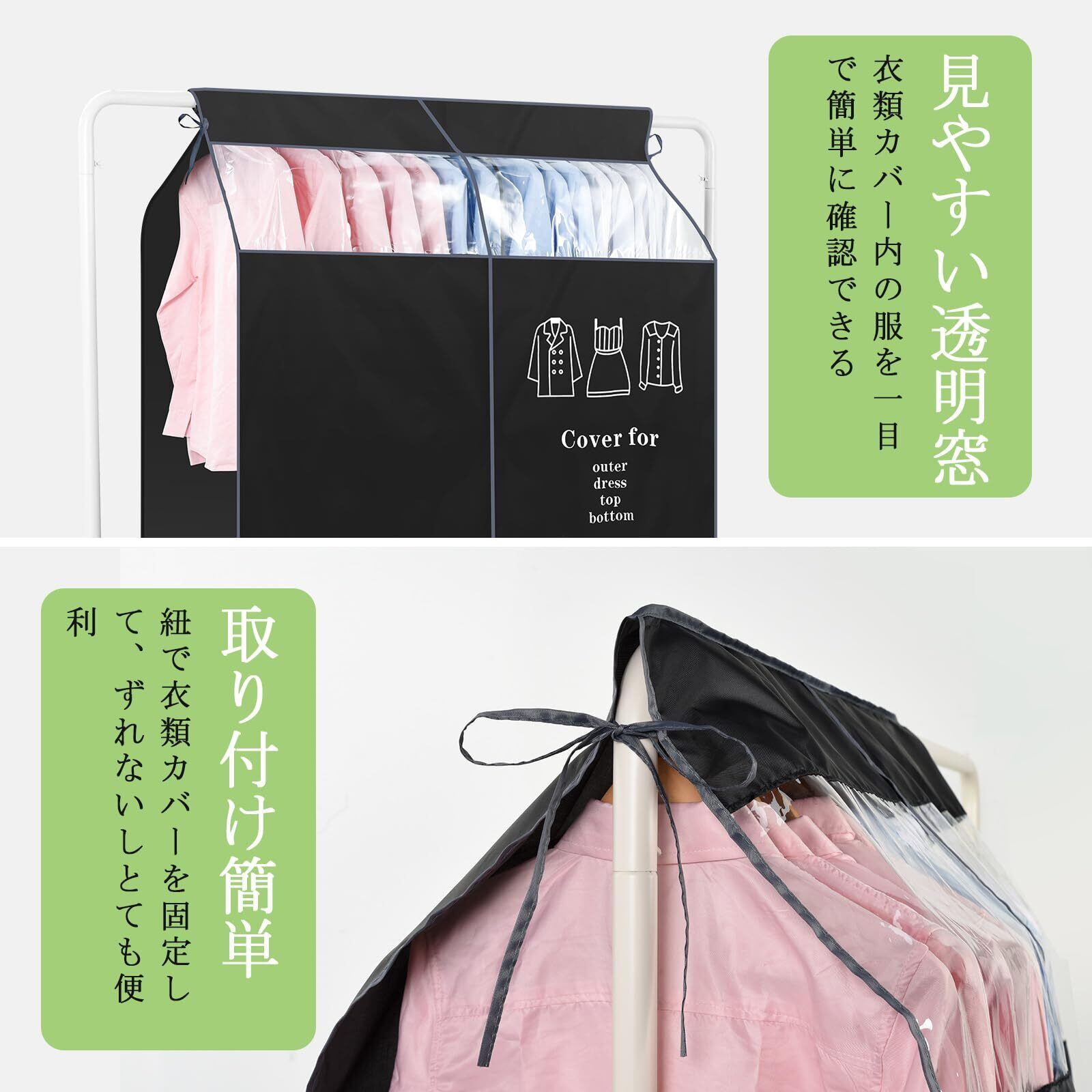 【見やすい透明窓】上の部分で透明の窓が設計されます。衣類カバー内の服を一目で簡単に確認できますから、いちいちカバーを開けて探さなくともよいです。窓部分はオックスフォード材質で、丈夫で長持ちです。抗菌で通気性も優れて、大切な服をいつも綺麗に守ります。洋服カバー中身が一目見えます、簡単に探せます。シンプルなデザインで、ブラックはどんなお部屋にも合うカラーです。