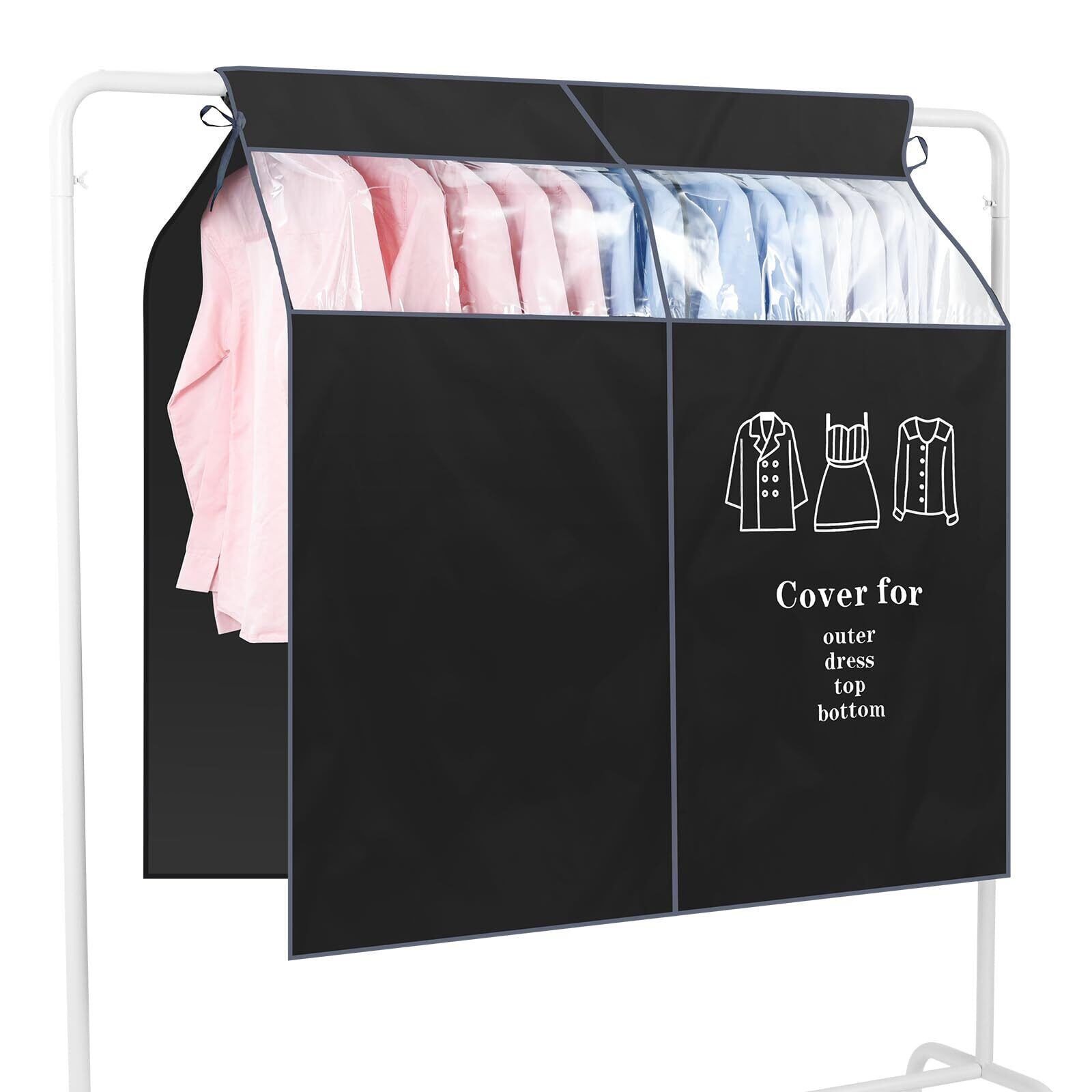 【紐固定】左右の両サイドに紐があり、どんな棚やハンガーラックに対しても十分の長さでそこに固定出来ます。カバーの取り付けがシンプル、両端のひもを結ぶだけで楽々です。日常服や制服、スーツなどをパイプハンガーに掛け、そしてカバーを覆うと何日が経っても汚れないし、服を取るや掛けるのも邪魔なしで行えます。