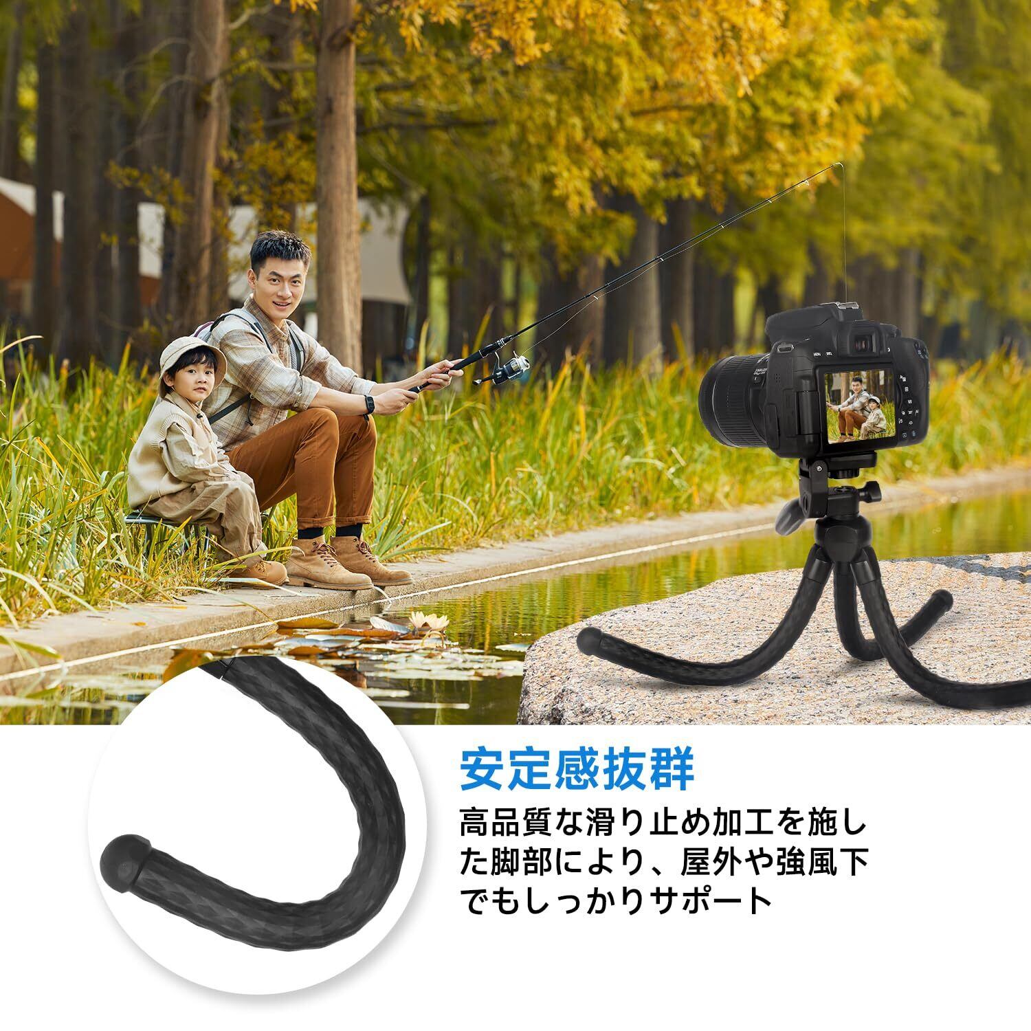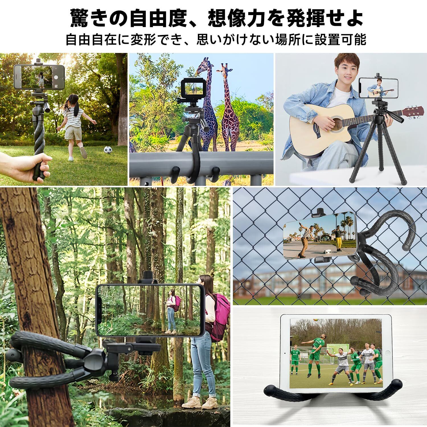 【どこにでも挟める】フレキシブルな三脚は色々な場所に巻き付けられて、不安定な場面でも思いがけない角度でスナップショット可能です。動物園、野外スポーツ、一人の旅行、自撮りなどに最適です。