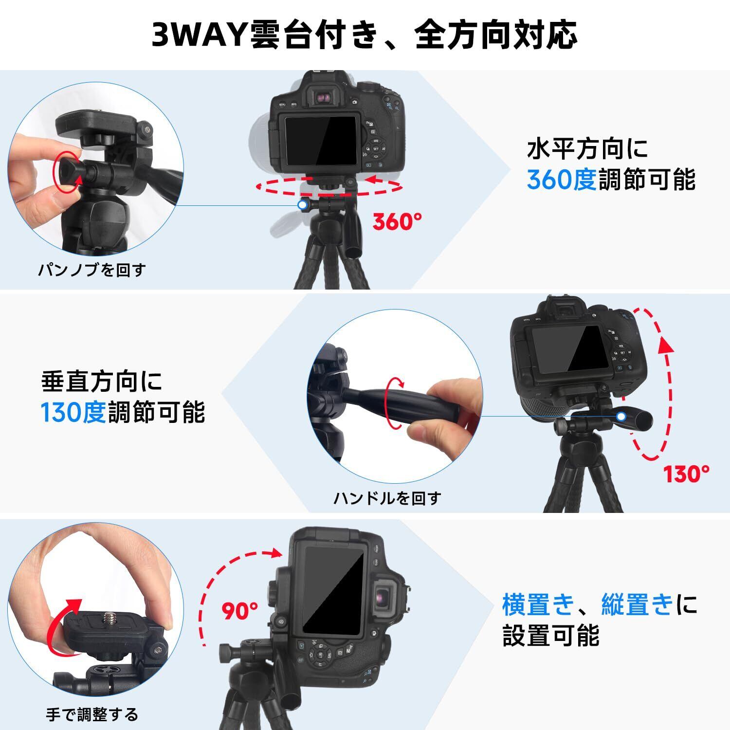 【3way雲台】くねくね三脚は3way雲台付き、垂直90度・水平180度・パノラマ360度まで回転可能です。手振れ防止で、多角度の撮影に満たし、高品質の写真を撮れます。