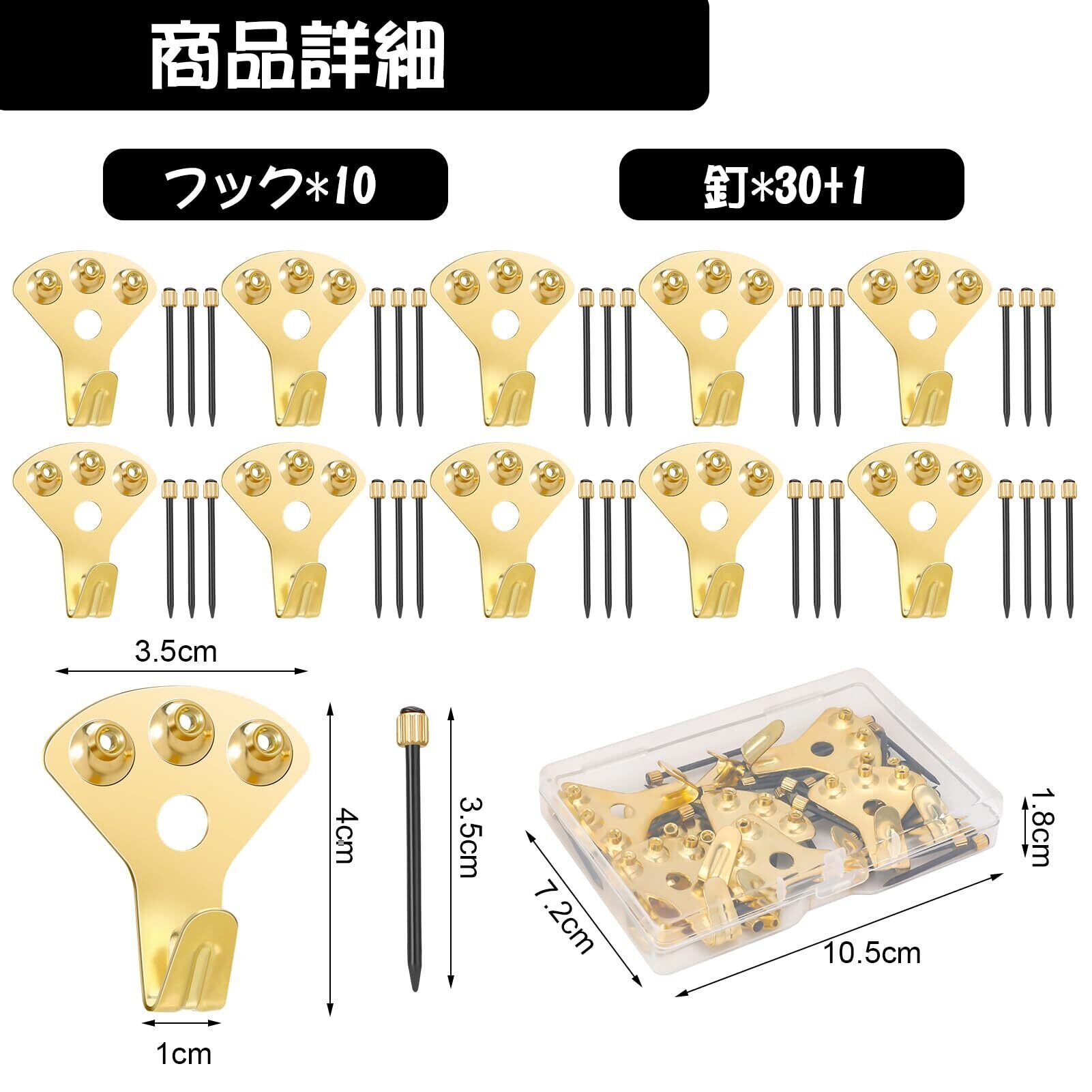 【パッケージ内容】壁掛けフック10個と取り付け用釘31個(予備の釘を1本追加する)が含まれています。カラー:ゴールド。サイズ:3.5×4cm。日常の壁掛け収納のニーズに簡単に対応できます。また、透明な収納ケースも付属して、紛失や汚れの心配がなく、フックをきちんと収納でき、持ち運びにも便利です。