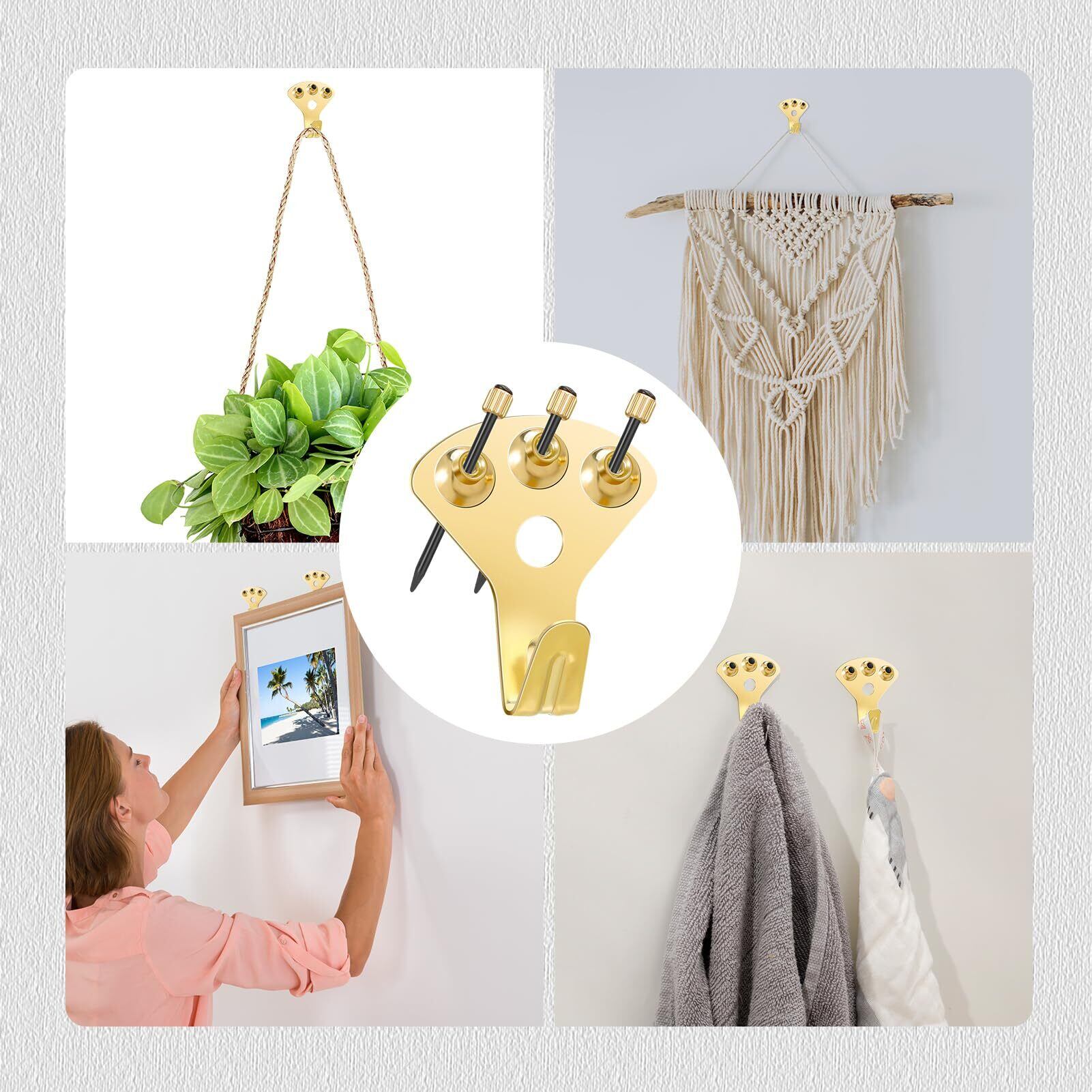 【幅広い用途】ご家庭やオフィスのほとんどのアイテムに幅広くお使いいただけます。写真、額縁、衣類、バッグ、鍵、キッチンツールフック、壁掛け植木鉢など、キラキラしている金色、どこでも輝いていて、お部屋の良い飾りになります。
