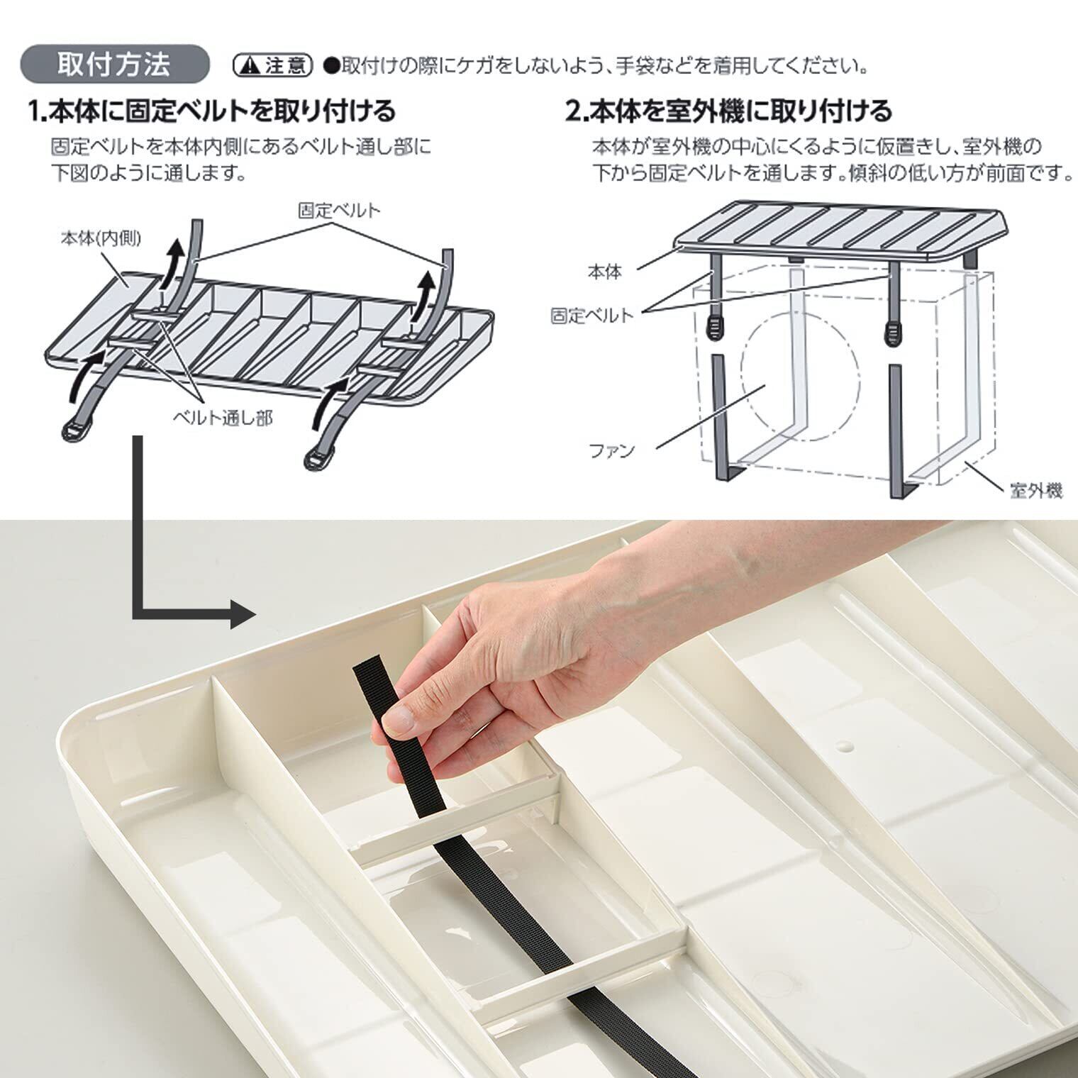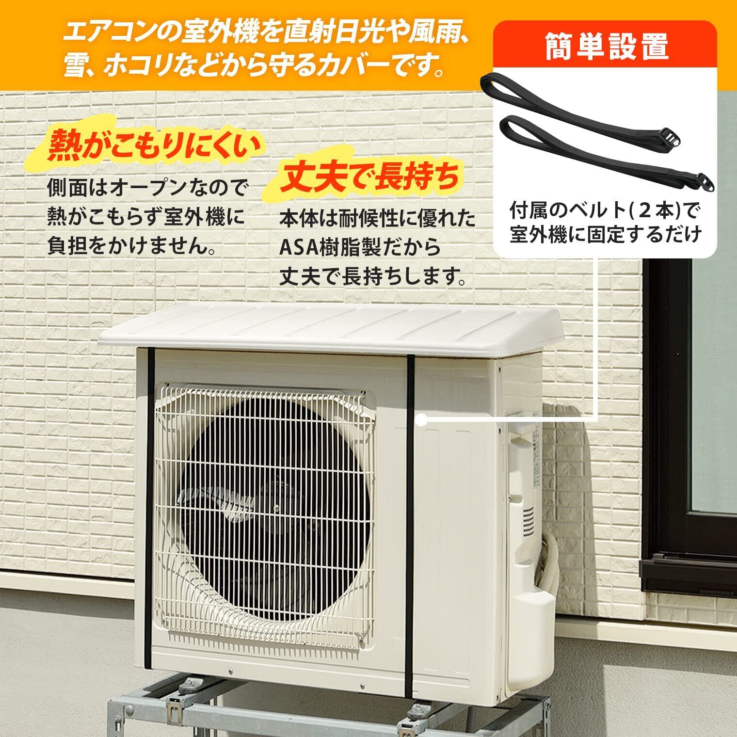 エアコンの室外機を直射日光や風雨、雪、ホコリなどから守るカバー。 太陽からの熱を遮り室外機の温度上昇を抑えることで夏場の冷房効率がアップ。 側面はオープンなので熱がこもらず室外機に負担をかけません。 本体は耐候性に優れたASA樹脂製だから丈夫で長持ち。 付属のベルトで室外機に固定するだけで簡単に設置できます。 [サイズ]〈製品サイズ〉約91×40×高さ6.5cm、〈取り付け可能室外機サイズ〉幅:52~88、奥行:~37cm [付属品]固定ベルト×2本 [素材・材質]<本体>ASA樹脂 <ベルト>ポリプロピレン <アジャスター>ポリアセタール [生産国]日本 ●本品は家庭用エアコン室外機専用です。用途以外に使用しないでください。 ●本品の上に物を置かないでください。