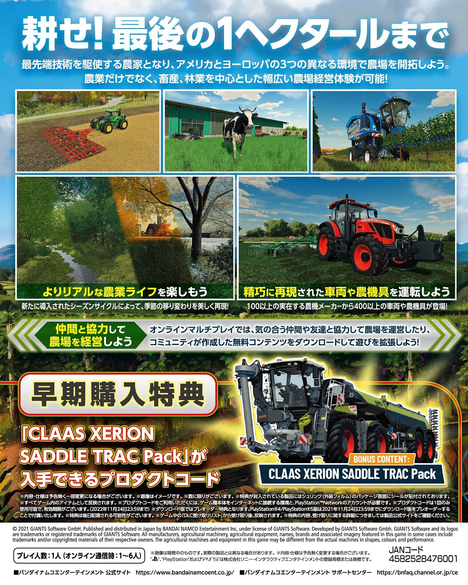 最先端技術を駆使する農家となり、アメリカとヨーロッパの3つの異なる環境で農場を開拓しよう。農業だけでなく、畜産、林業を中心とした幅広い農場経営体験が可能だ。新たに導入されたシーズンサイクルによって、季節の移り変わりが美しく再現され、よりリアルな農業ライフを楽しむことができる。John Deere、CLAAS、Case IH、New Holland、Fendt、Massey Ferguson、Valtraなど、100以上の実在する農機メーカ-から400以上の車両や農機具が登場!それらの重機を使って小麦やトウモロコシ、ジャガイモ、綿など、様々な作物の種を蒔いて収穫を楽しもう!新しく追加された機械カテゴリーや作物によってこれまでになかった生産物の収穫や農場の手入れ作業も体験可能だ。オンラインマルチプレイでは、気の合う仲間や友達と協力して農場を運営したり、コミュニティが作成した無料コンテンツをダウンロードして遊びを拡張しよう。今まで以上に自由度の高いプレイ体験が可能となり、成功した農業経営者を目指すのも夢ではない。さ、ファーミングをはじめ、楽しい時間を育もう!
