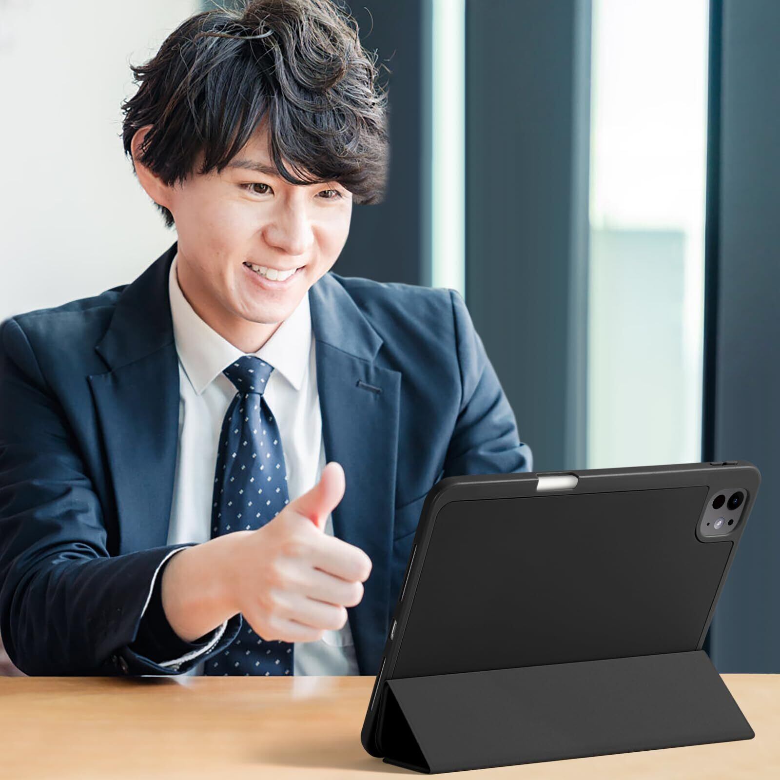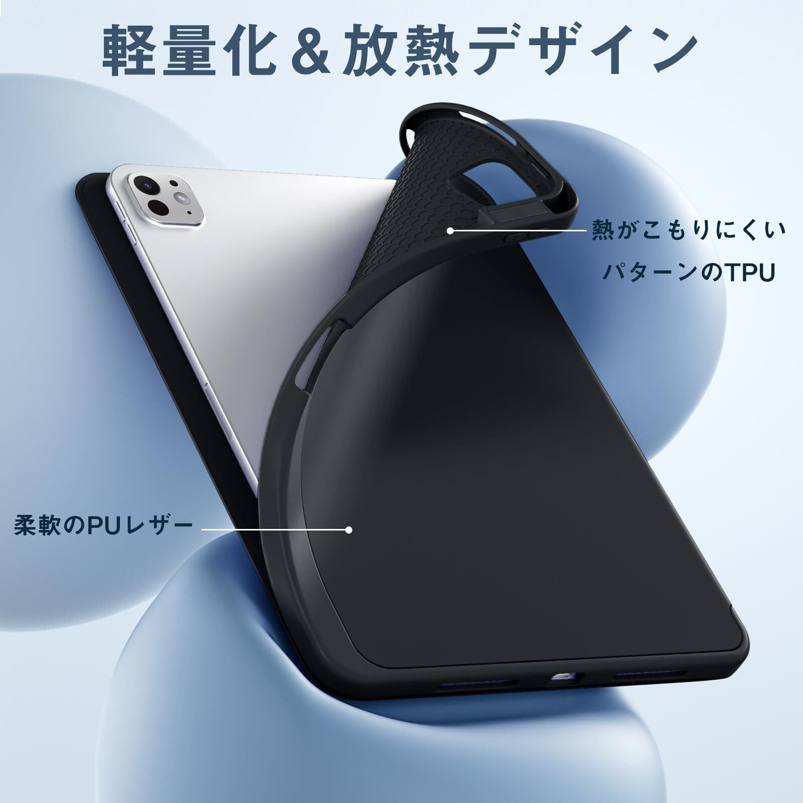 【全面保護・放熱デザイン】 ケースの前蓋は柔軟で耐衝撃性高い合成PU素材を採用され、端末にしっかりフィットして対応iPad Proを保護するだけでなく、滑らかな手触りを提供する。背面TPU素材なので、軽量、超薄を備えて取り出しも簡単、本体をキズ付かない。同時にケース内部は端末の放熱のためのエアーを逃す溝の空間を作るで本体に熱がこもるのを防ぐよう設計をする