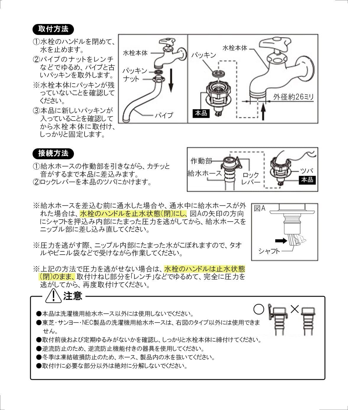 洗濯機用給水ホースをワンタッチで取付できます。