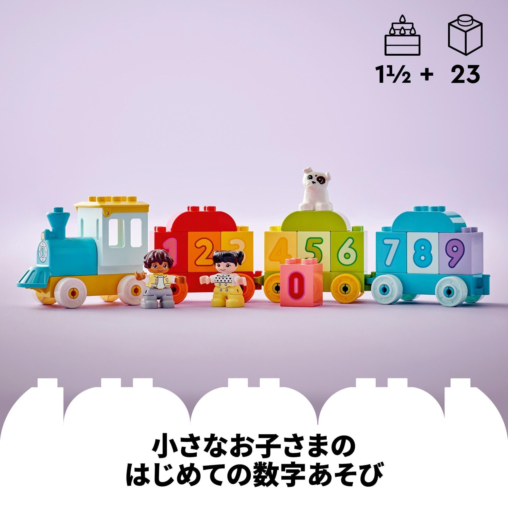 1歳半からのお子様が対象の レゴ デュプロ はじめてのデュプロ かずあそびトレイン(10954) 知育おもちゃで遊びましょう。小さな子どもたちを対象とした積み上げ、降ろし、重ねて、分けられる10以上の数字のブリック、女の子や男の子、いぬのデュプロフィギュアで遊びながら学ぶ楽しさは尽きません。 こちらの幼児用おもちゃプリスクール知育おもちゃでは、ワゴンに数字のブリックを積んだり、降ろしたり、正しい順番に並べたり、積み上げて数字のかべを作ったりできます。動く車輪、開閉式のルーフ、一緒になって楽しさを分かち合えるフレンドリーなデュプロキャラクターが搭載された数字の列車では、数字の数え方を学びながら、小さな子どもたちが想像力を働かせて遊びながら成長できます。 幼児用レゴ デュプロ知育おもちゃは就学前の子どもたちに自由自在に遊び、自己を表現し、楽しく学習する機会を与えます。デュプロの積み木プレイセットがあれば、 ご両親と小さな子どもたちが一緒に組み立てながら、少しずつ成長を実感することができます。 乗り物のプレイセット完成サイズ: 高さ10 cm、長さ47 cmです。 23ピース入り。
