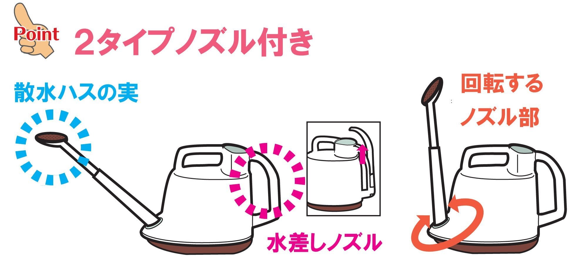 ノズルを回転させて上向きにすれば狭いシンクでも水が入れやすい便利なじょうろ