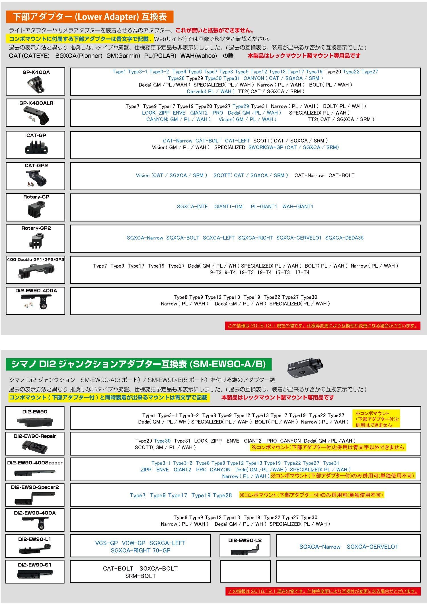 GP規格は ゴープロ HEROのカメラシリーズや シマノスポーツカメラ ガーミン Virb XEなどゴープロ互換カメラが装着が可能です.またライトアダプターを付ければライトの取付も 例 キャットアイなら 【GP-CATHL6】 レザインなら【GP-LEZ4】オーライトなら【GP-OLIGHT】など
