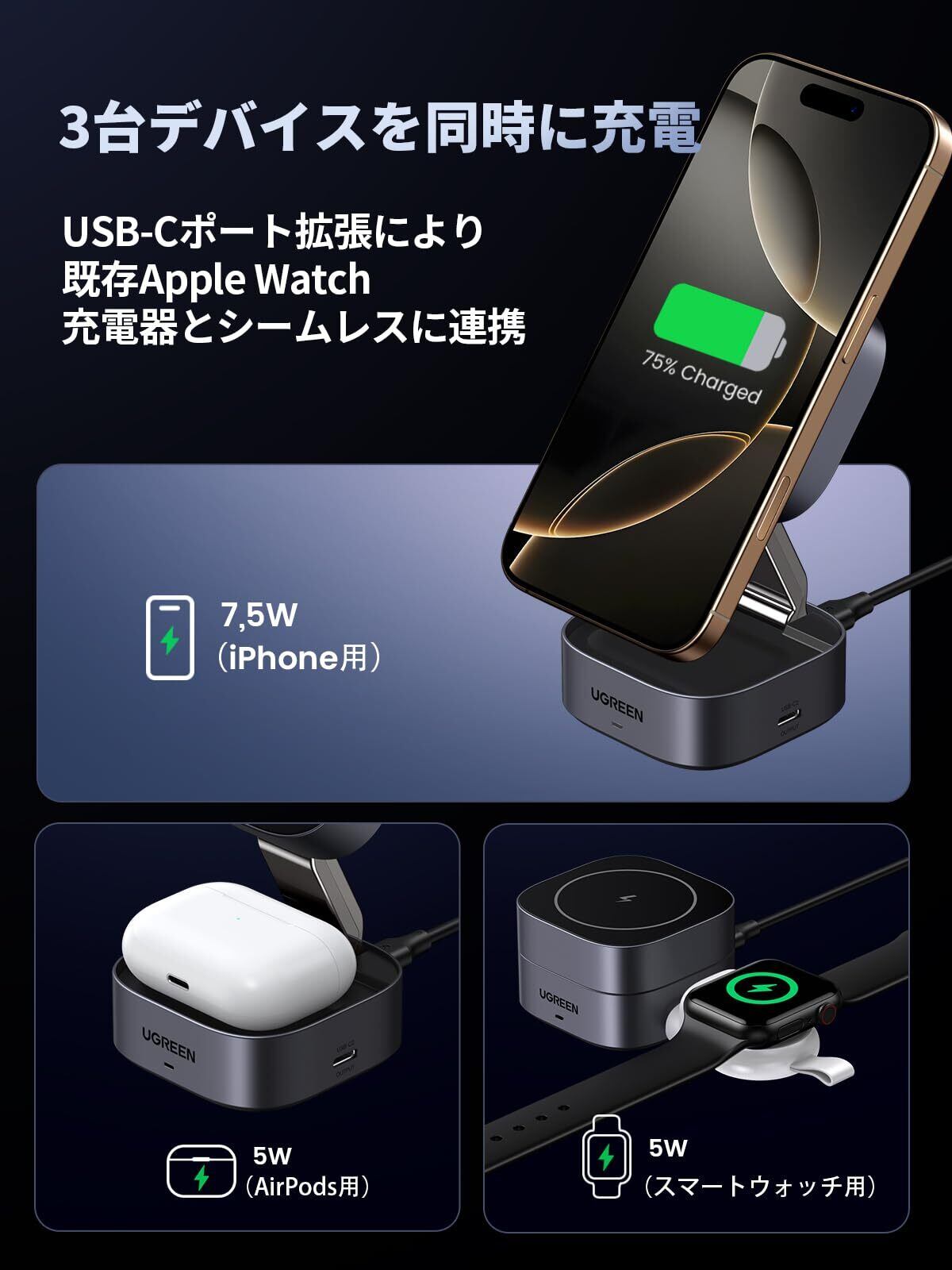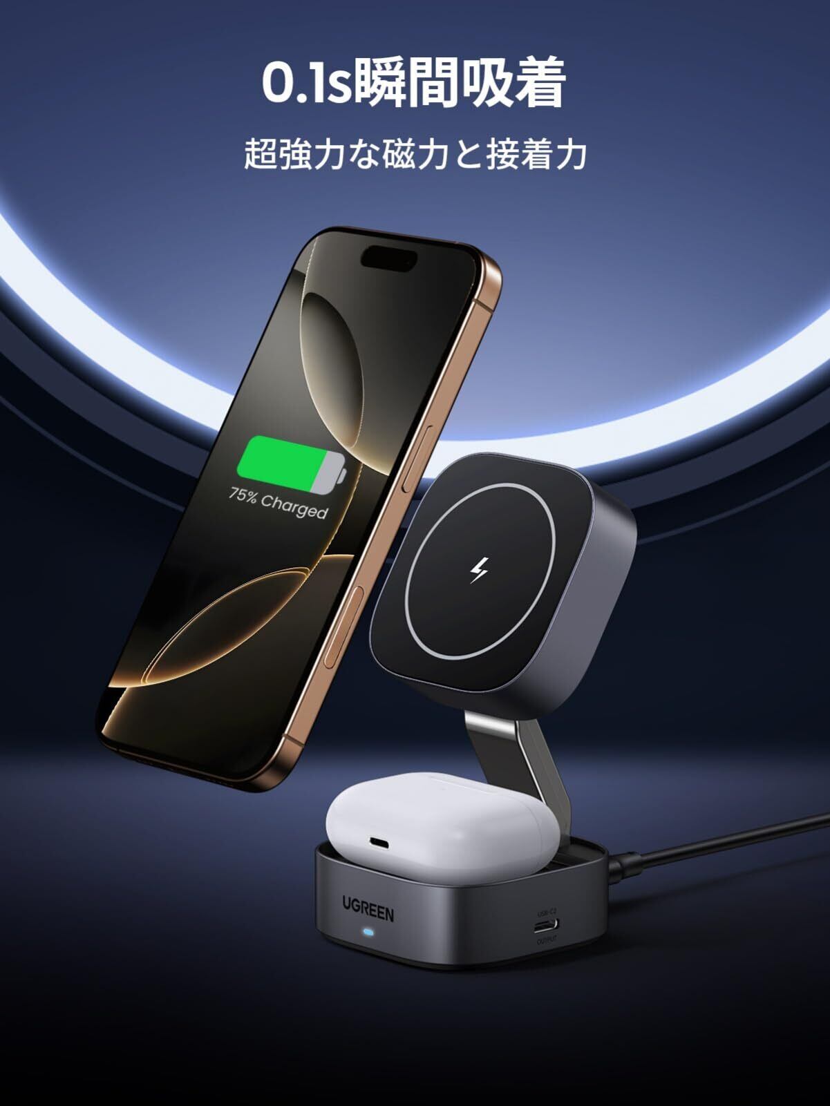 1台3役※ワイヤレス充電:UGREEN MagFlow iPhone充電スタンドは、iPhone(7.5w)とAirPods(5w)を同時に急速充電することができ、右側にUSB-Cポートを備えており、時計や他のデバイスは、充電器またはC-Cケーブルを介して充電することができます。最大5 Wまで急速充電でき、同製品よりも充電速度が40%速い。(USB C充電アダプタは含まれていません)